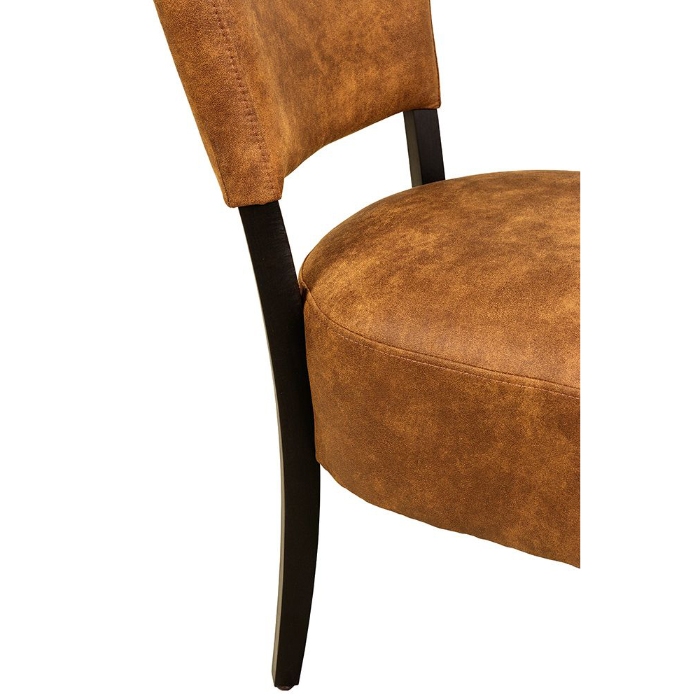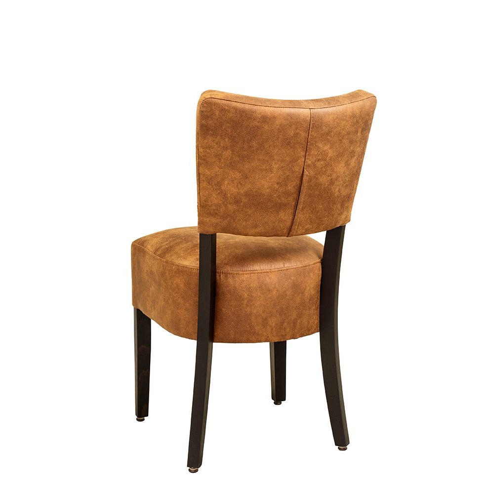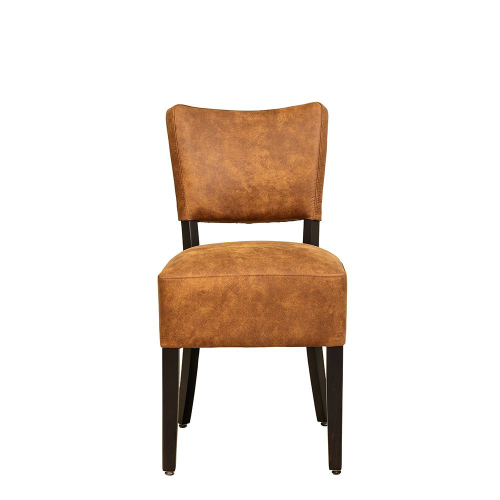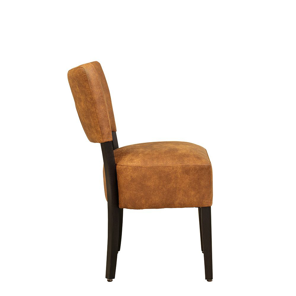 Der Bakino ist ein Vollpolsterstuhl mit einem dicken Polstersitz sowie einen gepolsterten Rücken. Die Füße sind in einem sehr dunklen Braun lackiert.