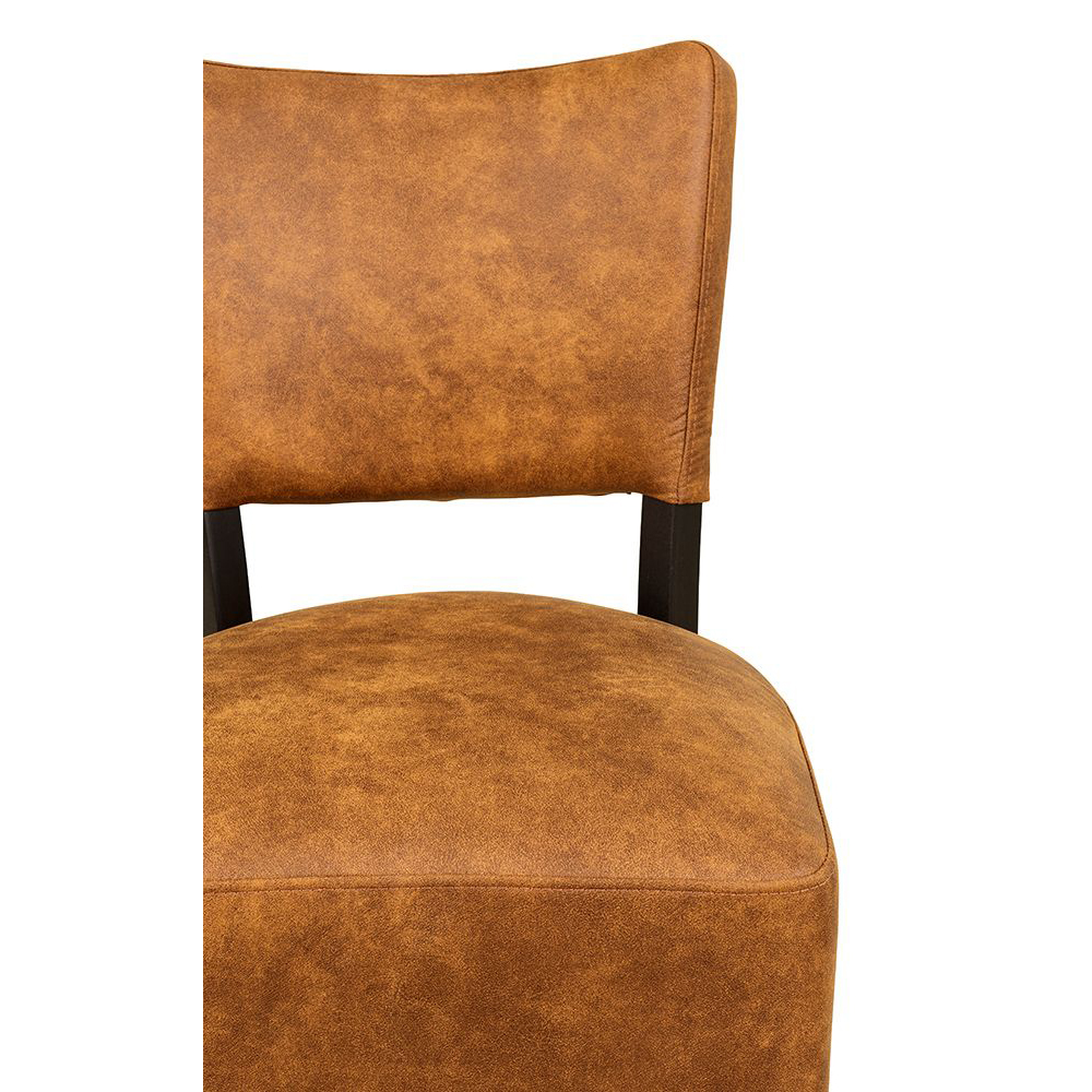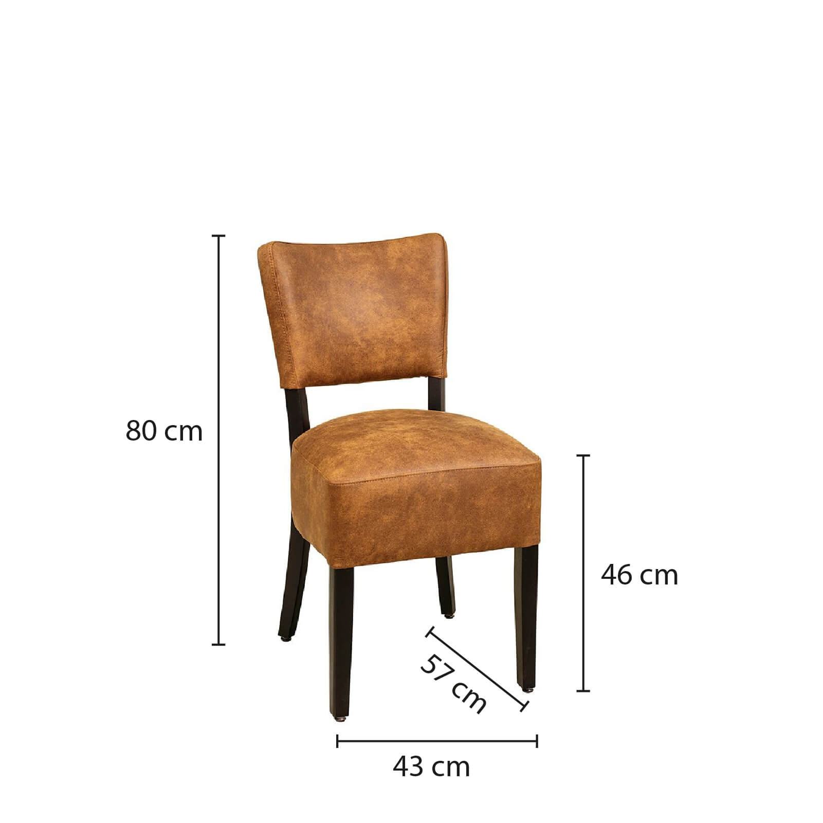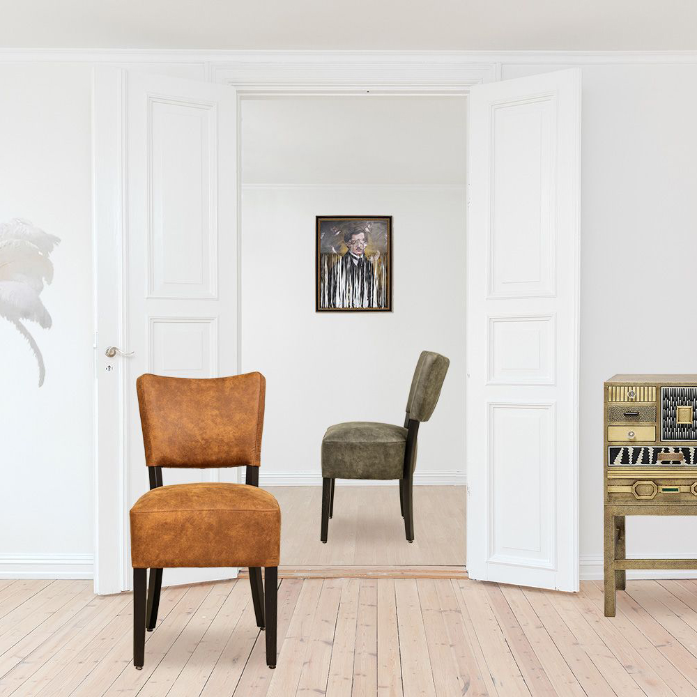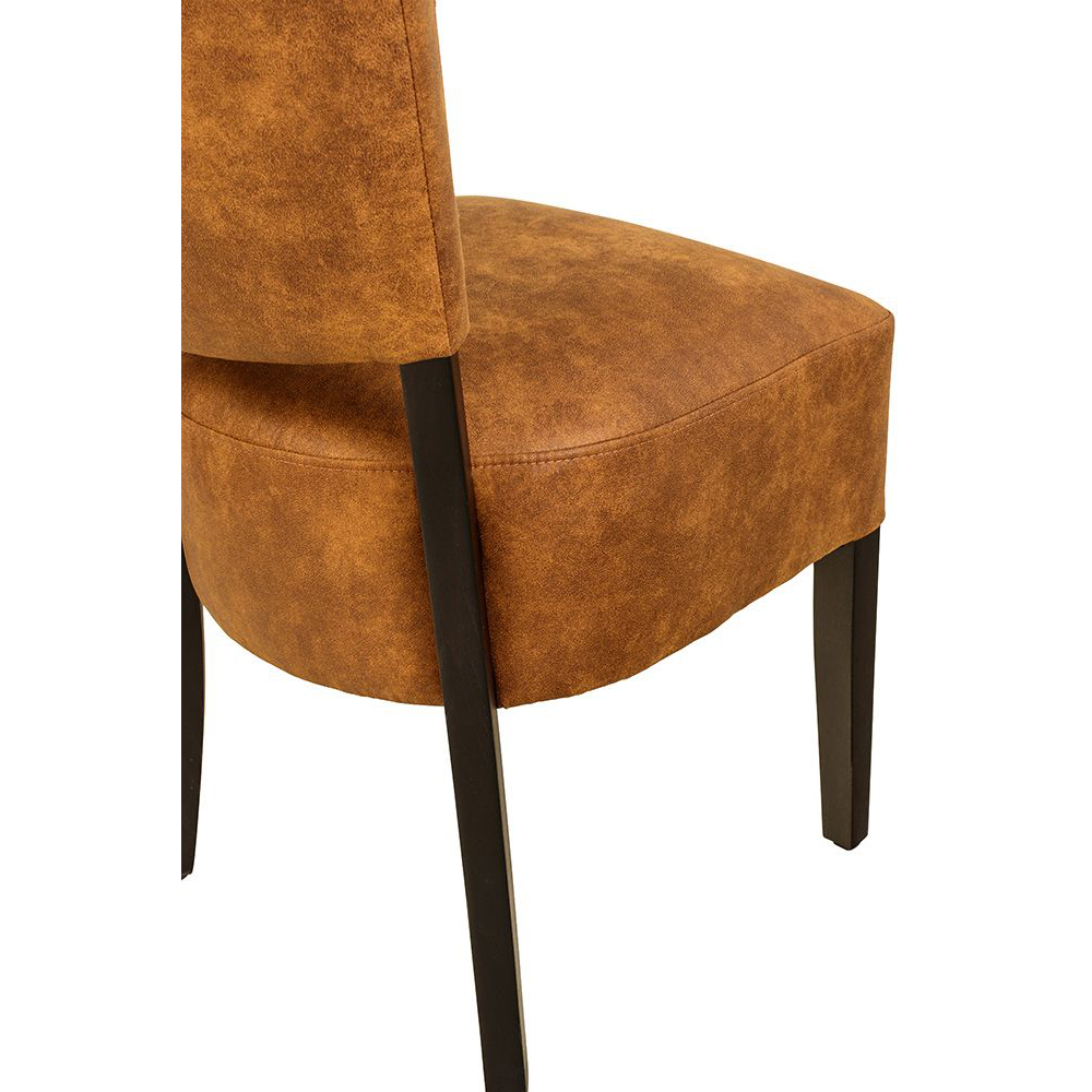 Der Bakino ist ein Vollpolsterstuhl mit einem dicken Polstersitz sowie einen gepolsterten Rücken. Die Füße sind in einem sehr dunklen Braun lackiert.