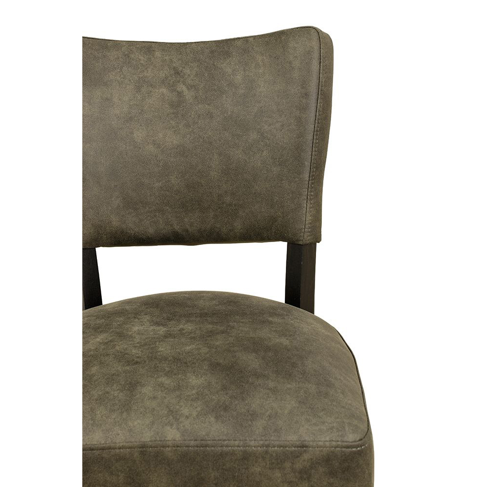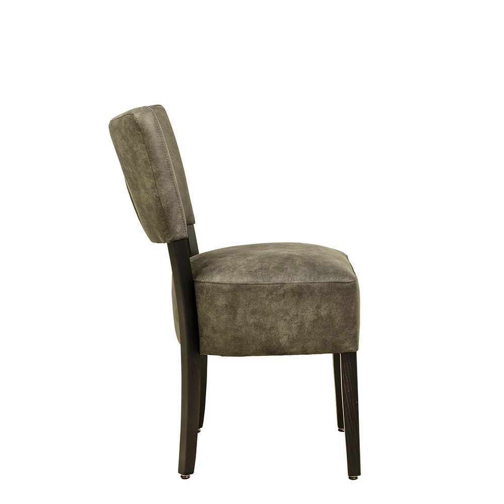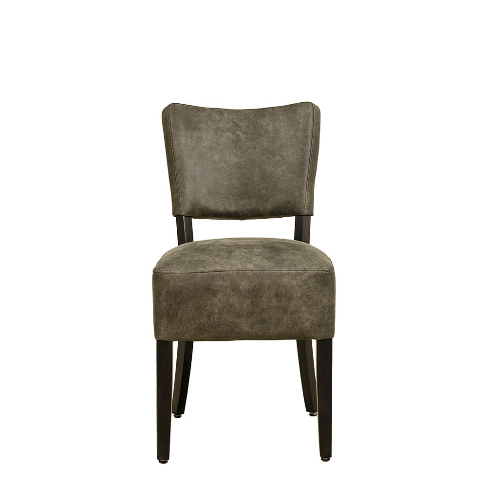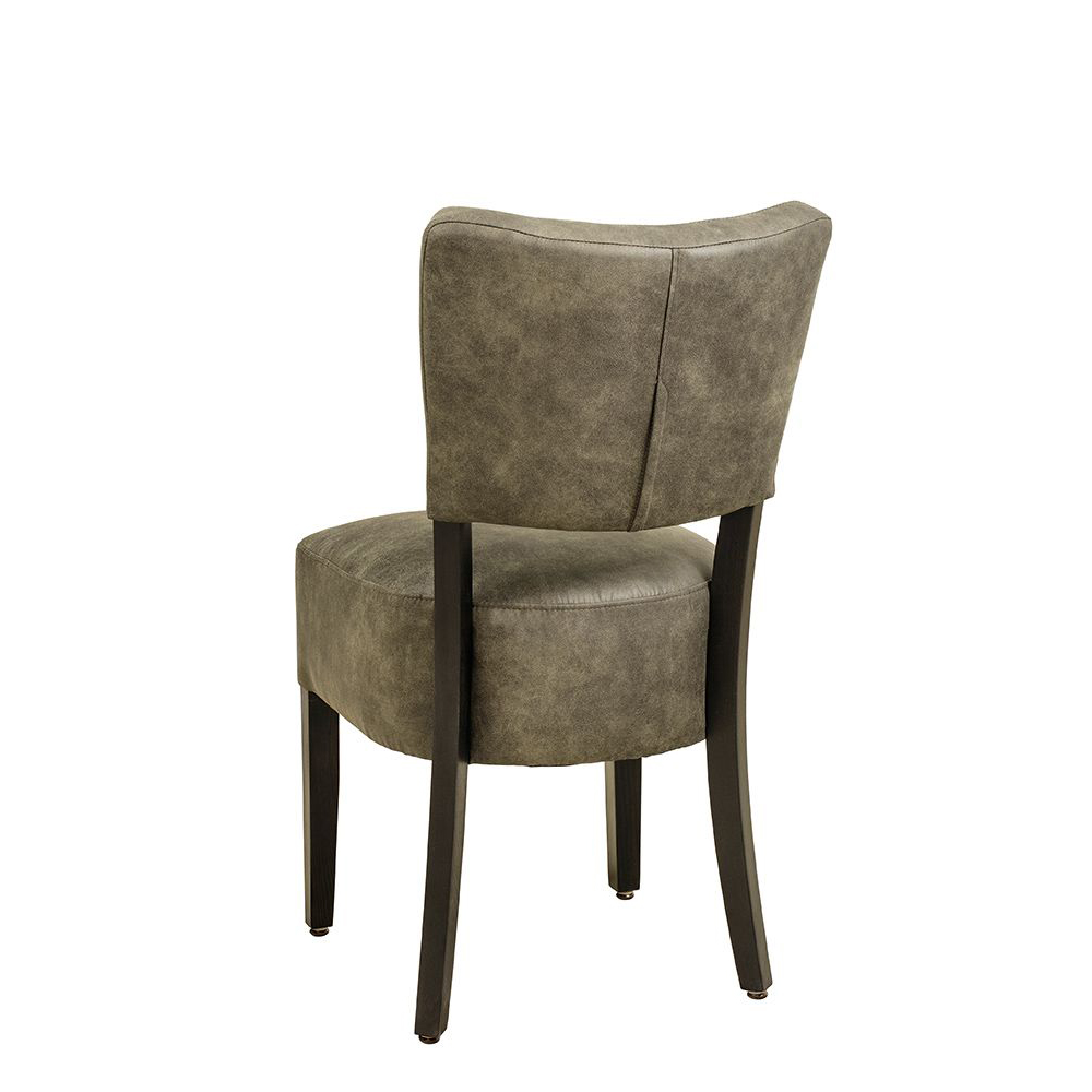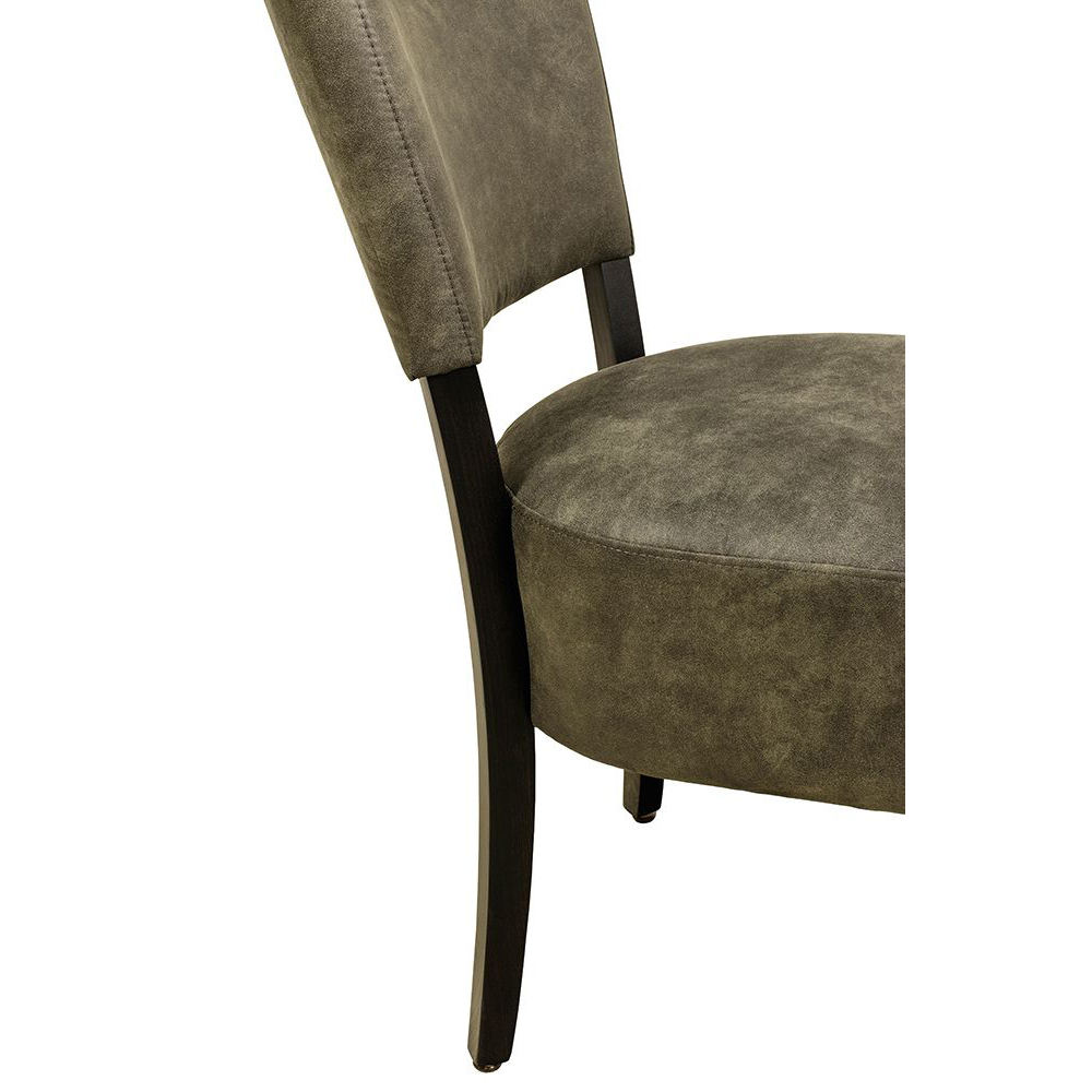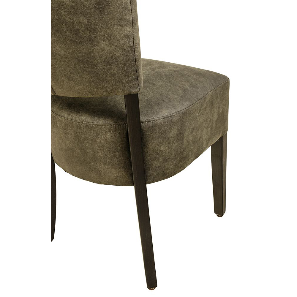 Der Bakino ist ein Vollpolsterstuhl mit einen dicken Polstersitz sowie einen gepolsterten Rücken. Die Füße sind in einem sehr dunklen Braun lackiert.