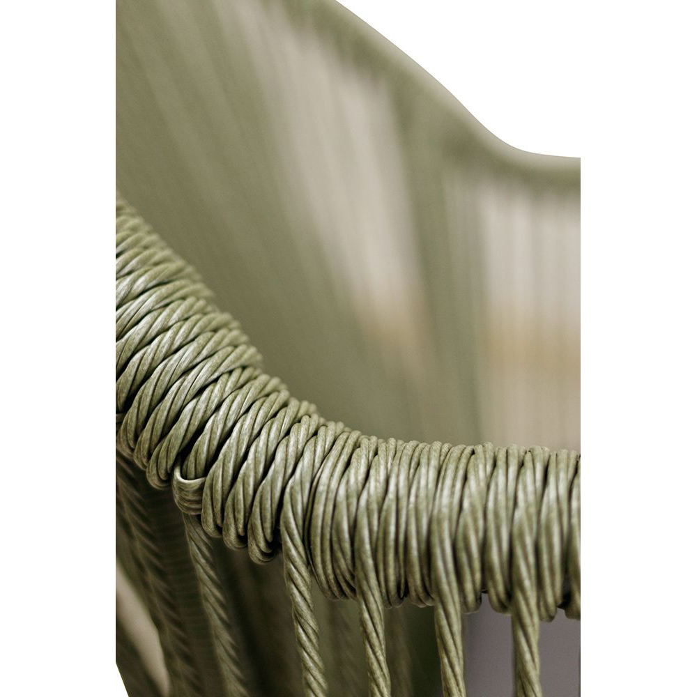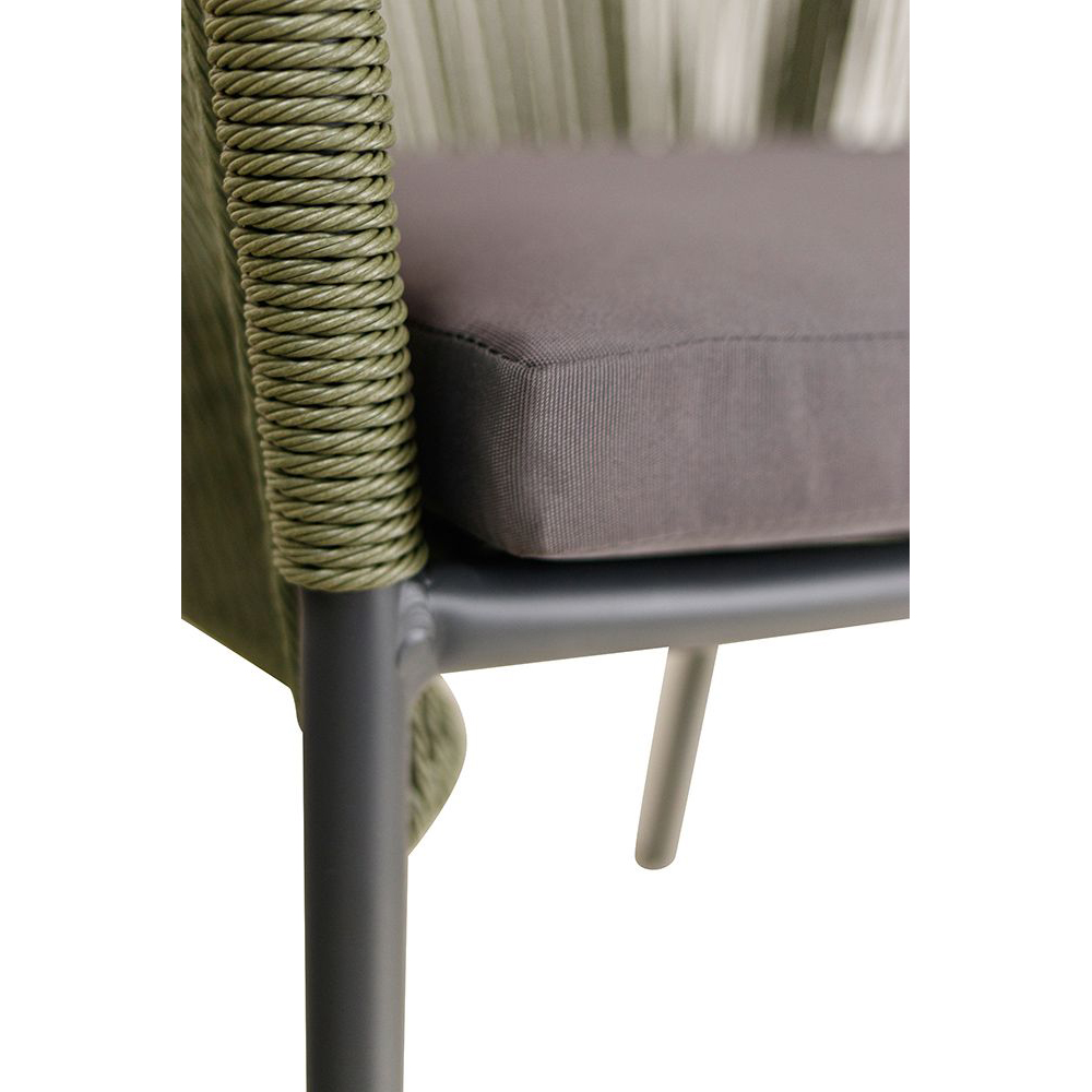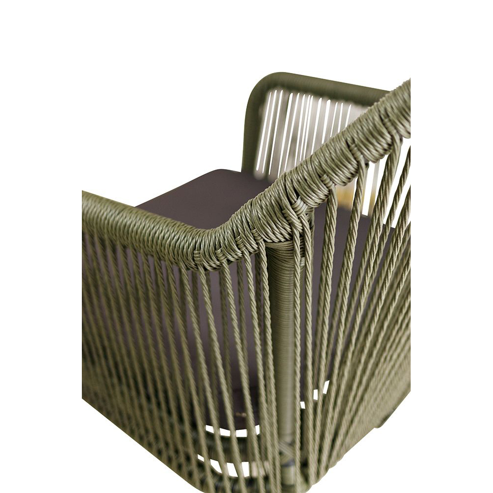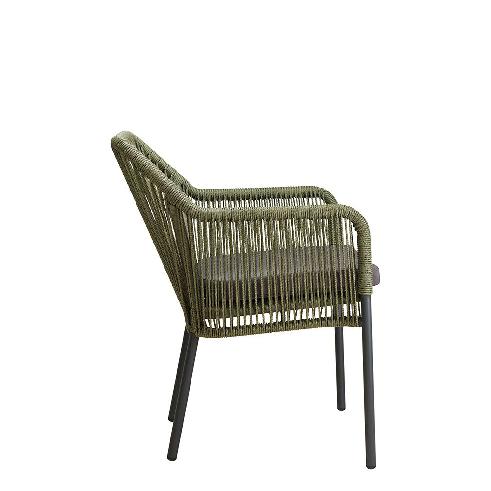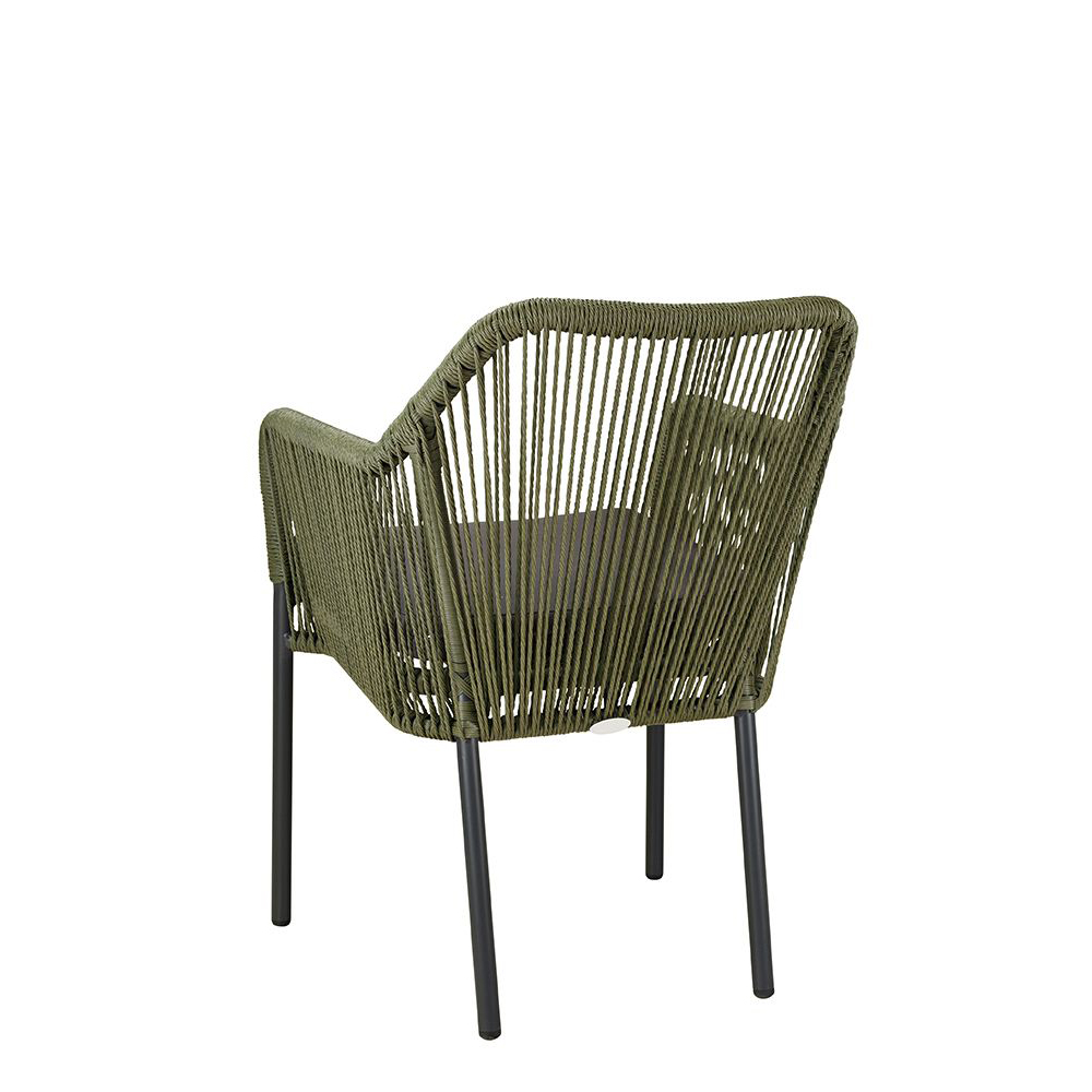 Ein Terrassenstuhl mit Armlehnen und Sitzkissen für höheren Sitzkomfort. Rücken ist mit strapazierfähigen, witterungsbeständigem und pflegeleichtem Outdoorseil bespannt. Das Seil ist schnell trocknend. Der Stuhl ist stapelbar.