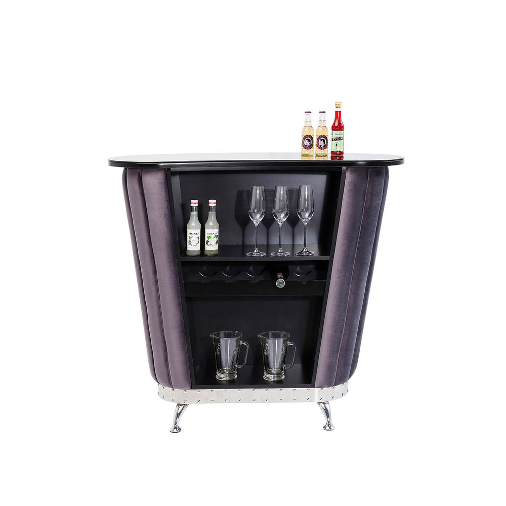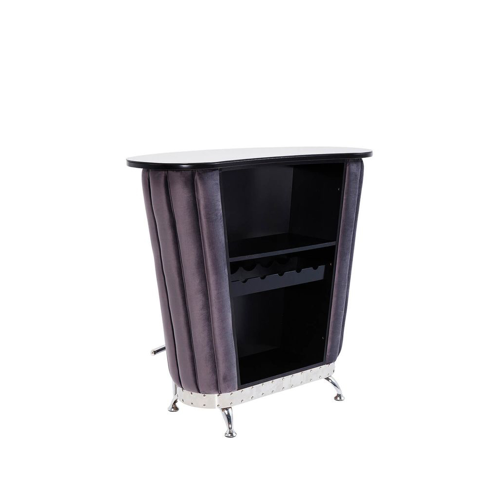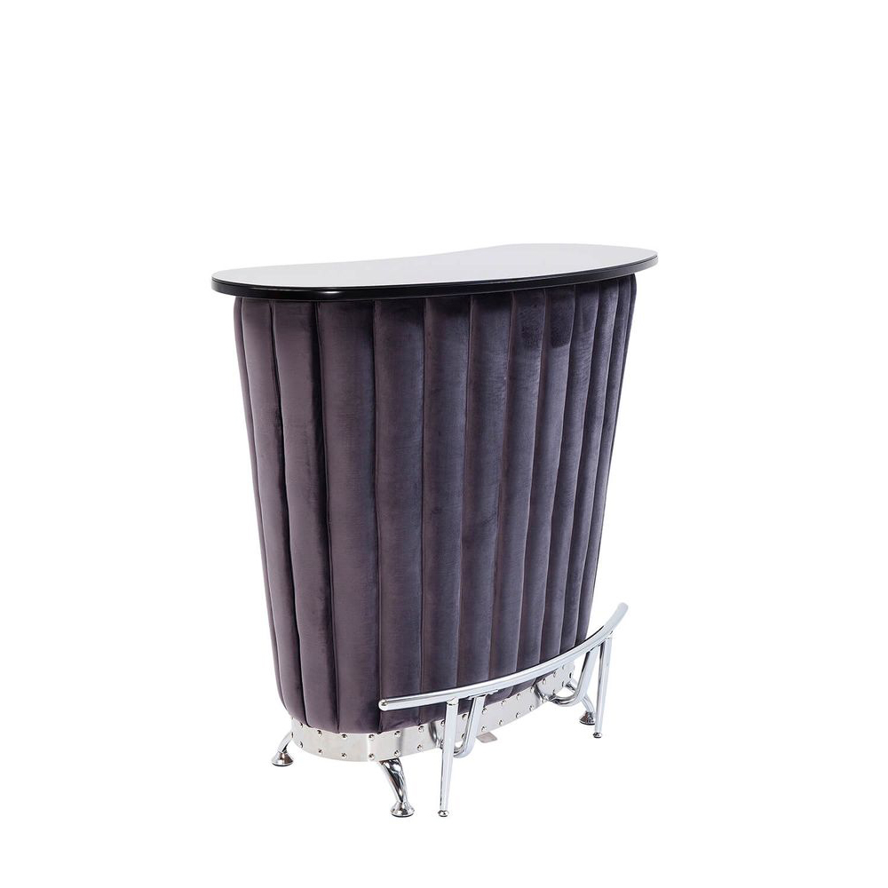 Eine Bar im glamourösen Retro-Design erstrahlt in besonderer Eleganz. Der Materialmix aus Chrom, Samt und gefärbtem Glas verleiht ihr eine exklusive Note. Im Inneren bieten großzügige Fächer ausreichend Platz für Gläser und Flaschen. Ein wahrer Luxus für das Wohnzimmer, der den Raum aufwertet und stilvoll in Szene setzt.