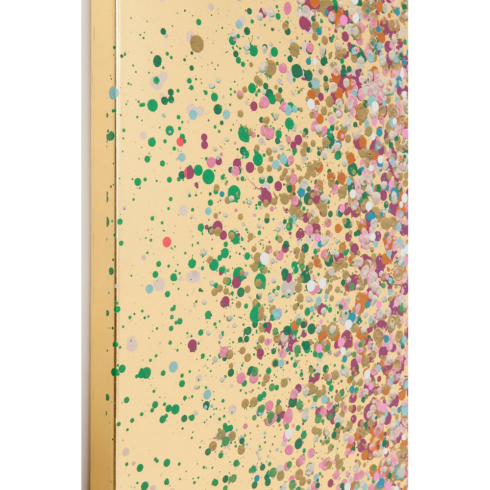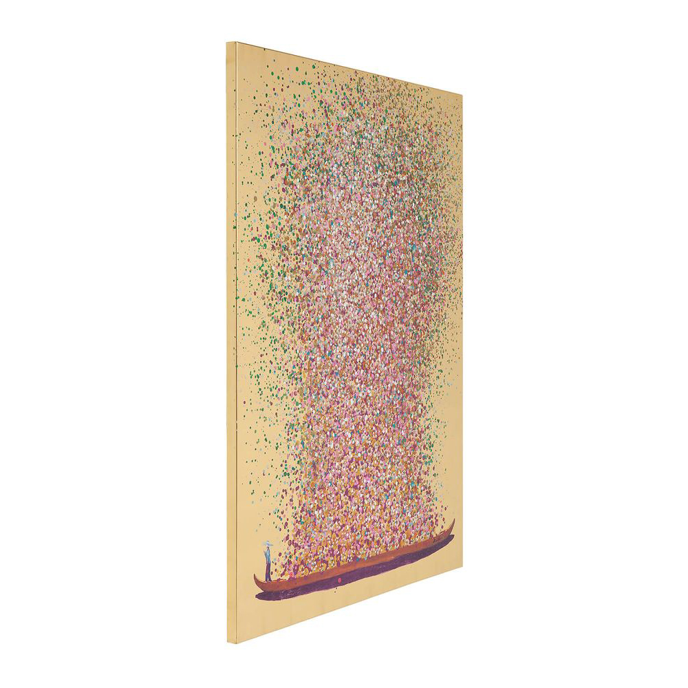 Ein rechteckiges, buntes Wandbild wurde auf eine Canvas-Leinwand gedruckt und anschließend detailreich von Hand mit Acrylfarbe veredelt. Das große Motiv zeigt ein Meer aus zahlreichen zarten Blüten in Pastellfarben, die auf einem goldenen Hintergrund schweben. Dieses Bild verspricht, Fröhlichkeit, gute Laune und entspannten asiatischen Flair in jeden Raum zu bringen. Die handgemalten Blütendetails und Farbakzente verleihen dem Gemälde eine ansprechende Oberflächenstruktur.