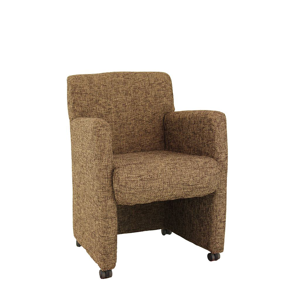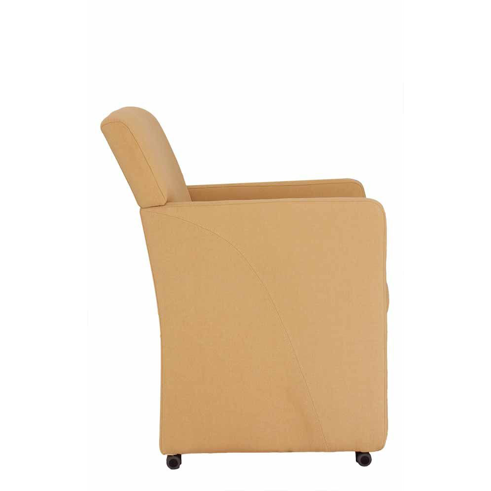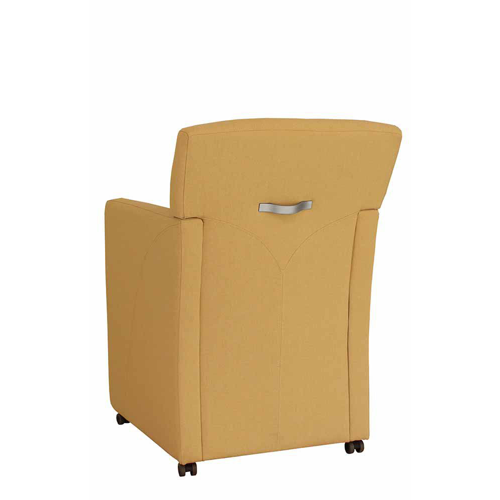 Der Buckla ist ein gemütlicher Sessel mit gepolsterten Armlehnen und Rollen. Gerade in Loungen oder Cafés macht sich der Vollpolsterstuhl besonders gut.