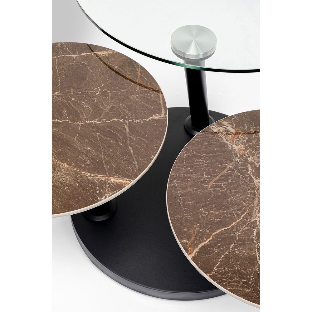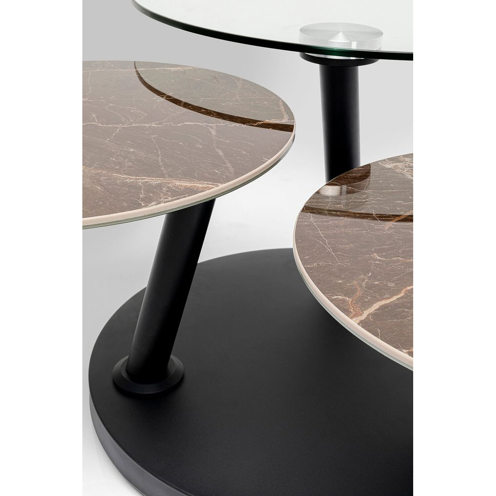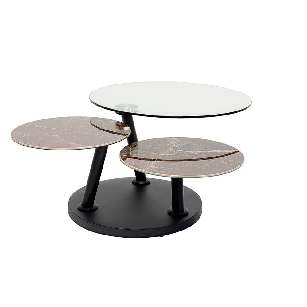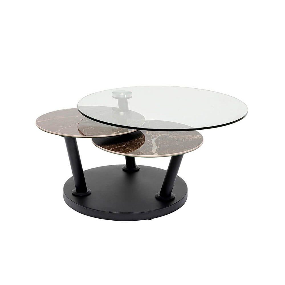 Unser schwarzer Couchtisch mit drei Tischplatten bietet Flexibilität dank seiner drehbaren Platten. Er besteht aus hochwertigen Materialien wie Keramik, Stahl und ESG-Glas, die für Stabilität und Langlebigkeit sorgen. Das stilvolle Design präsentiert sich in schwarzer Farbe und verschiedenen Oberflächen. Dank der drehbaren Platten ist der Tisch von 80 bis 124 cm Breite anpassbar.