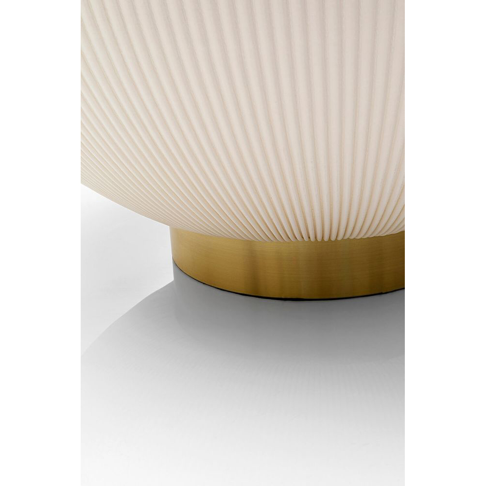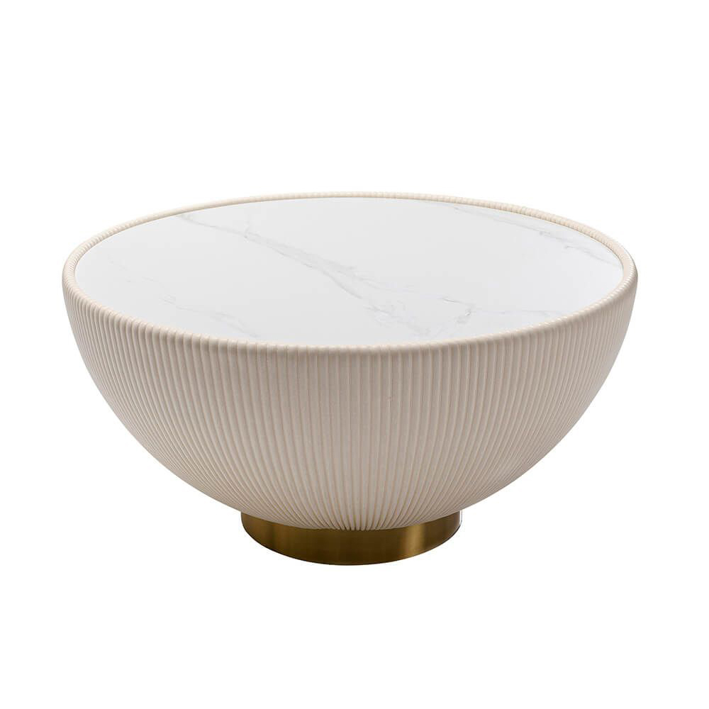 Ein runder Couchtisch in einem sanften Creme-Weiß, der sowohl als eleganter Beistelltisch im Wohnzimmer als auch als Nachttisch im Schlafzimmer fungiert. Sein Blickfang ist der gesteppte Bezug aus Kunstleder, der ihm einen besonderen Charme verleiht.