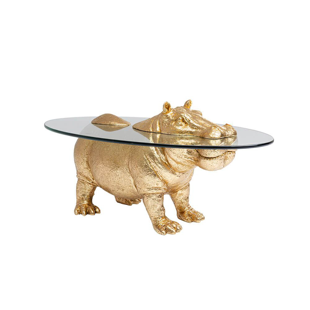 Das goldene Nilpferd verleiht diesem Wohnzimmer-Tisch aus Glas einen einzigartigen Blickfang. Die große, ovale Tischplatte besteht aus 7 mm dickem ESG-Sicherheitsglas mit geschliffener Kante und misst 80 cm in der Länge und 32 cm in der Tiefe. Der Couchtisch ist vielseitig kombinierbar und passt sowohl zu klassischen als auch modernen Einrichtungsstilen.