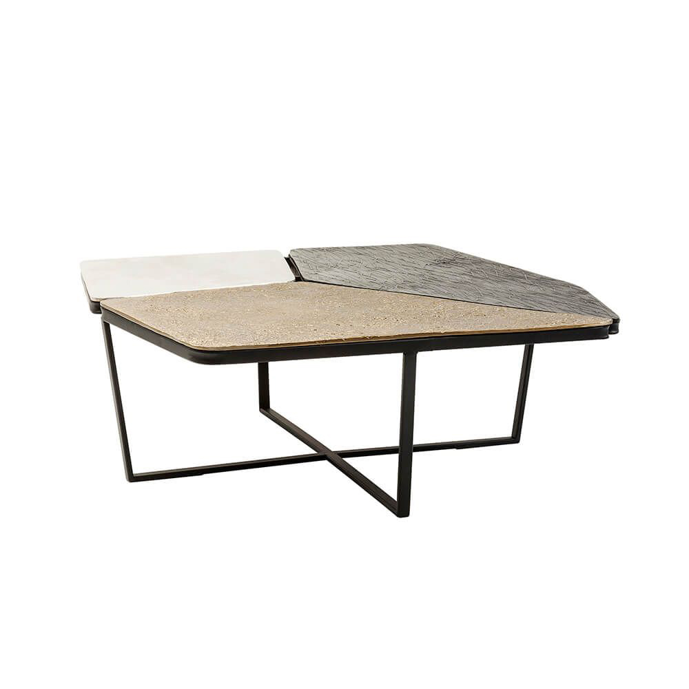 Ein großer, eckiger Couchtisch präsentiert sich mit drei farbigen Tischplatten, die von einem schwarzen Stahlgestell getragen werden. Die Tischplatte besteht aus drei asymmetrischen Elementen mit unterschiedlichen Oberflächenstrukturen, die in den Farben Bronze, Anthrazit und Grauweiß gehalten sind. Dieser Beistelltisch strahlt den Charakter eines künstlerischen Möbelobjekts aus. Er wurde massiv und solide aus Stahl und Aluminium gefertigt und wird bereits montiert geliefert. Seine natürlichen Farben und das von der Natur inspirierte Design harmonieren perfekt mit Holzmöbeln und Ledersofas.