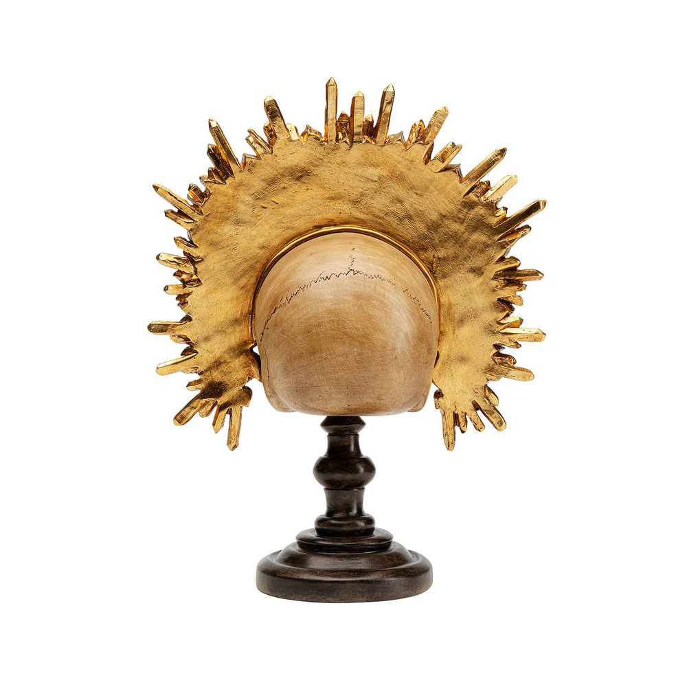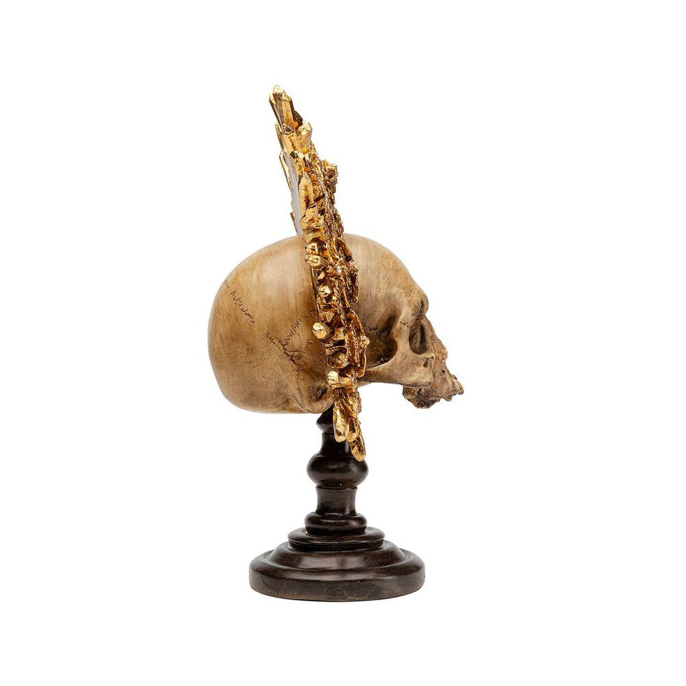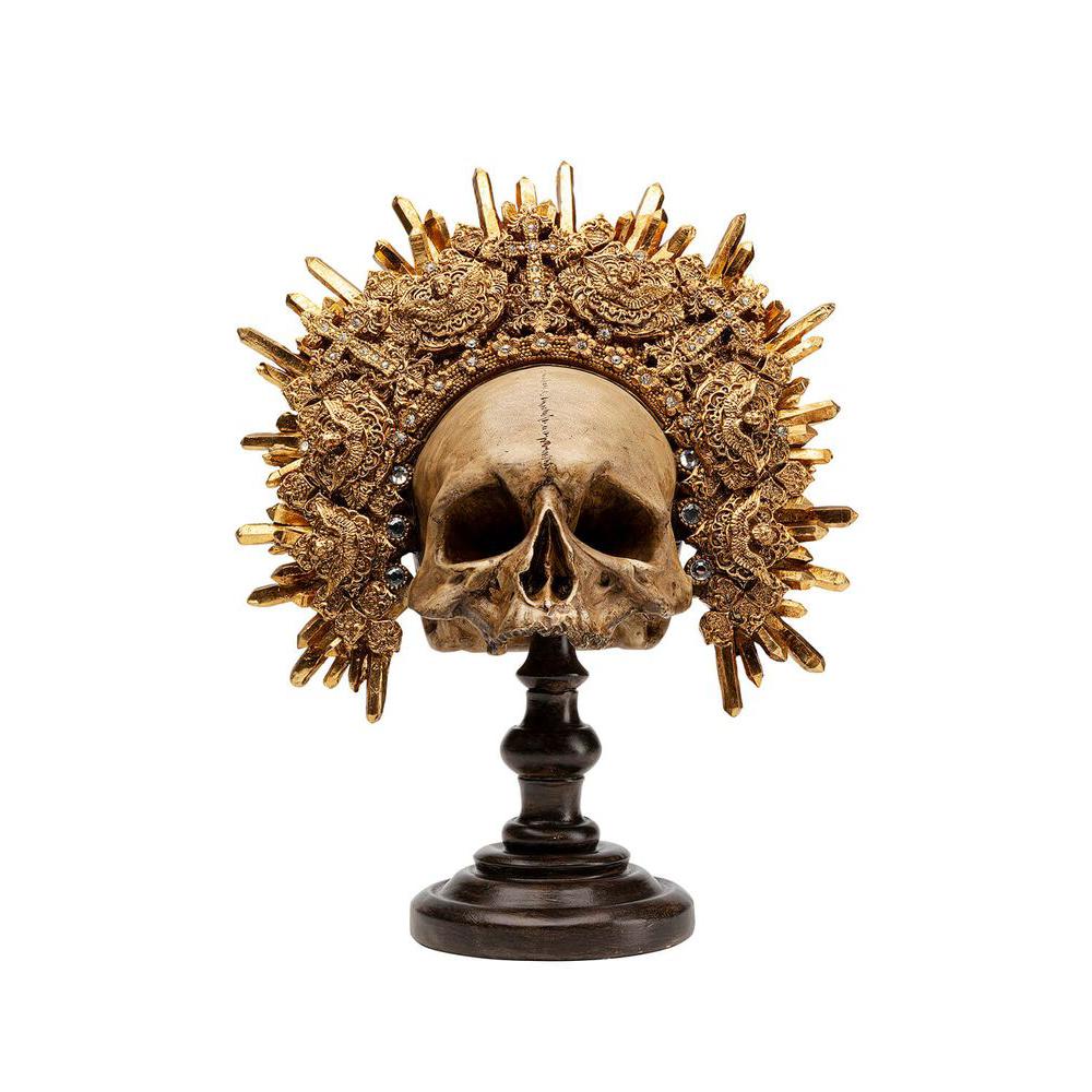 Aus der Schatzkammer stammt diese Totenkopf-Skulptur mit antiker Optik und aufwendigem, goldenem Kopfschmuck. Mit diesem auffälligen Dekor setzen Sie ein gewagtes Statement. Obwohl sie auffällt, fügt sie sich dennoch nahtlos in jede Einrichtung ein und wird so zum Schlüsselstück in jedem Stil.