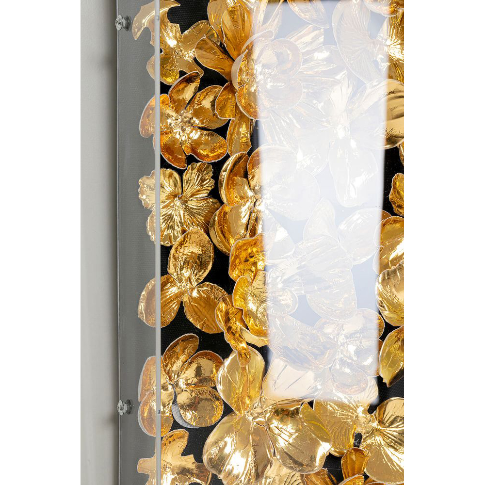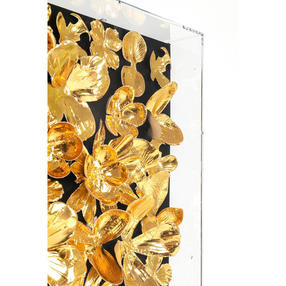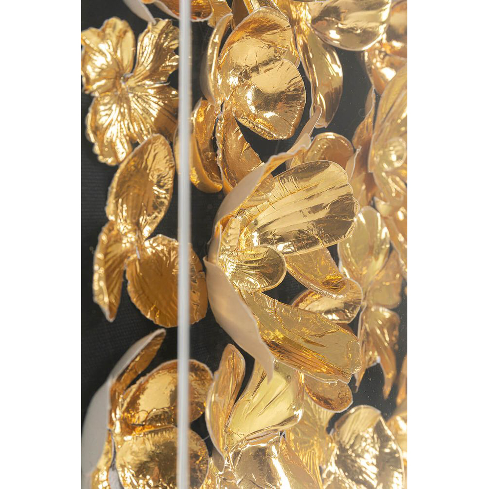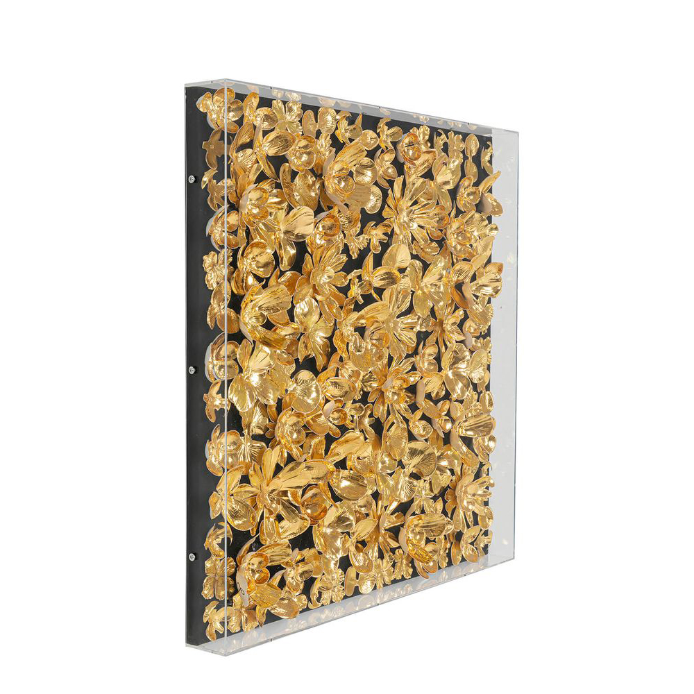 Ein dreidimensionales, quadratisches Wandbild präsentiert ein Meer aus goldfarbenen Blüten auf einem schwarzen Hintergrund – jedes Stück ist handgefertigt! Unterschiedliche Blütenformen, aus Papier gefertigt, erhalten im Schaukasten aus Acrylglas ihren großen Auftritt. Das außergewöhnliche Bildobjekt erweckt den Eindruck eines vertikalen Gartens mit goldenem Glanz, wodurch es auch auf kleineren Wänden dank seines Formats perfekt zur Geltung kommt.