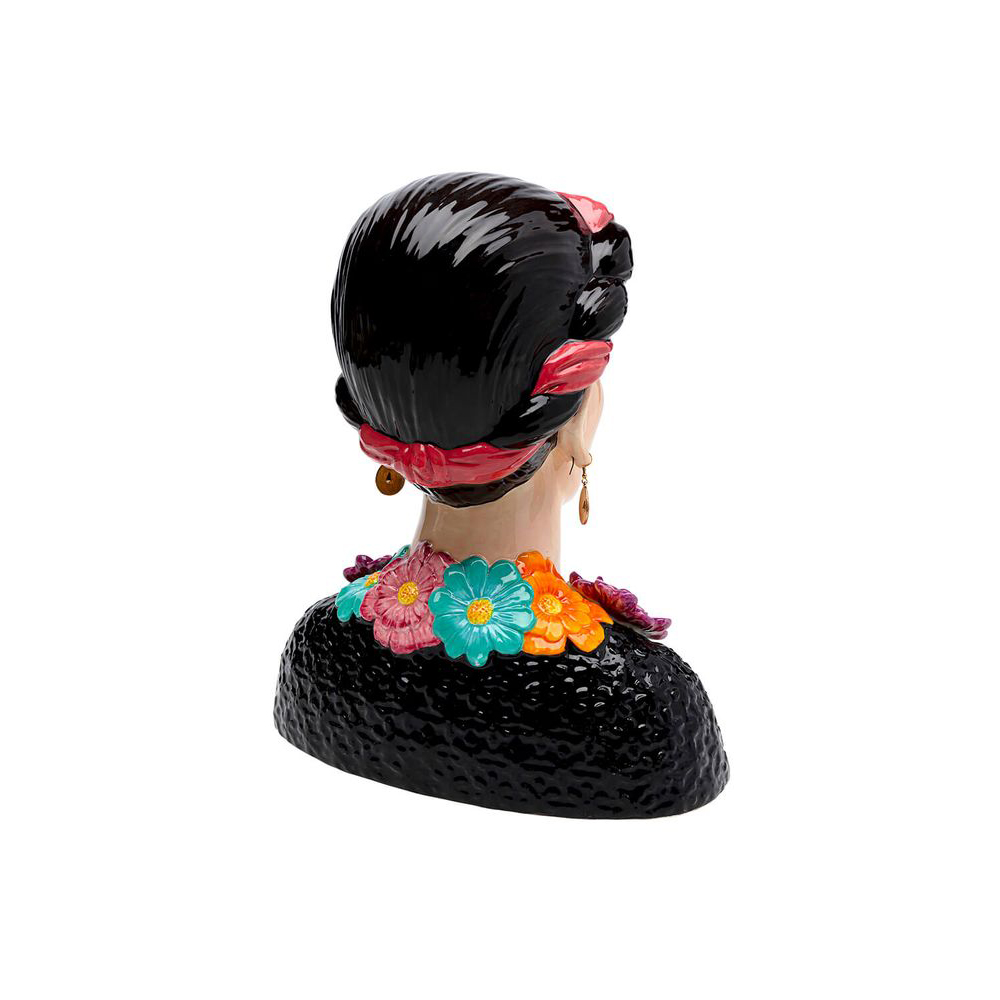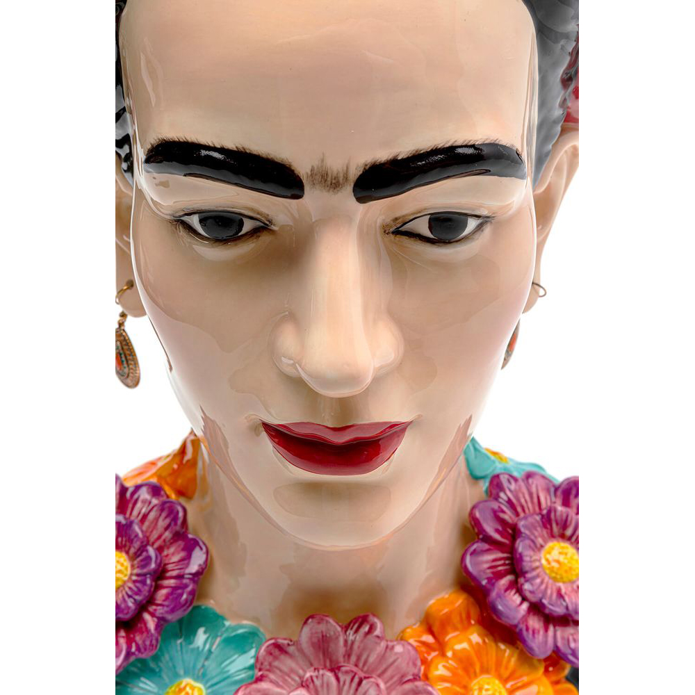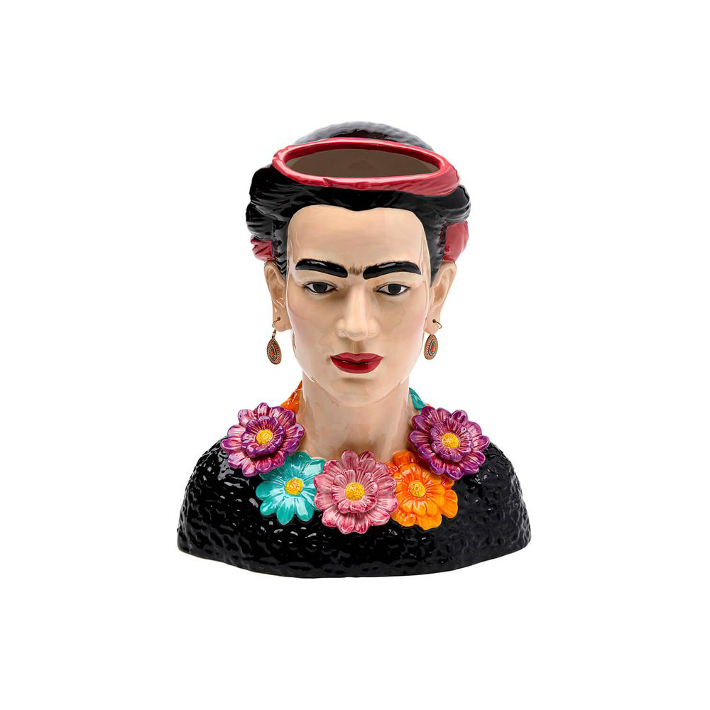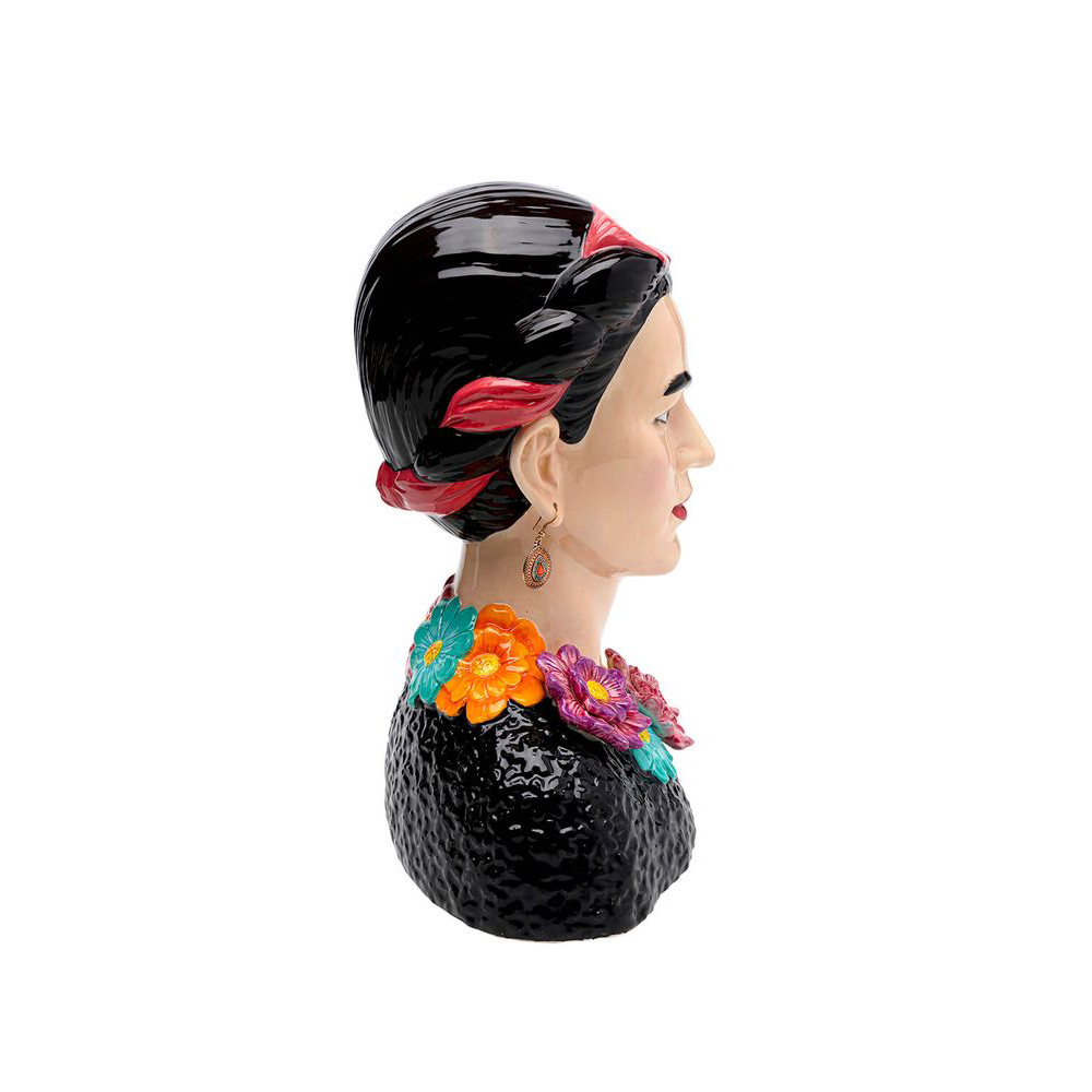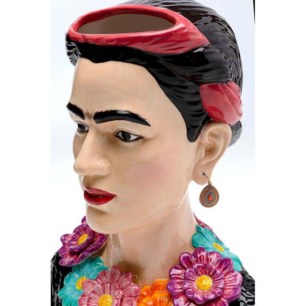 Eine Vase mit Charakter: Diese Keramikvase in Form eines Frauenoberkörpers mit eleganten Ohrringen und einem Blumendekolleté erinnert an die legendäre Malerin. Wie ihr Namensgeberin vereint dieses dekorative Objekt spielerisch Elemente des Boho-Stils, des Surrealen und des Volkstümlichen - ein wahres Kunstwerk. Aufgrund der Materialbeschaffenheit von Keramik sind solche Produkte normalerweise nicht vollständig wasserdicht. Daher empfehlen wir, ein separates, wasserdichtes Gefäß für das Blumenwasser zu verwenden, um die Oberfläche zu schützen. Eine Möglichkeit ist es beispielsweise, ein Marmeladenglas oder ähnliches in die Keramikvase zu stellen.
