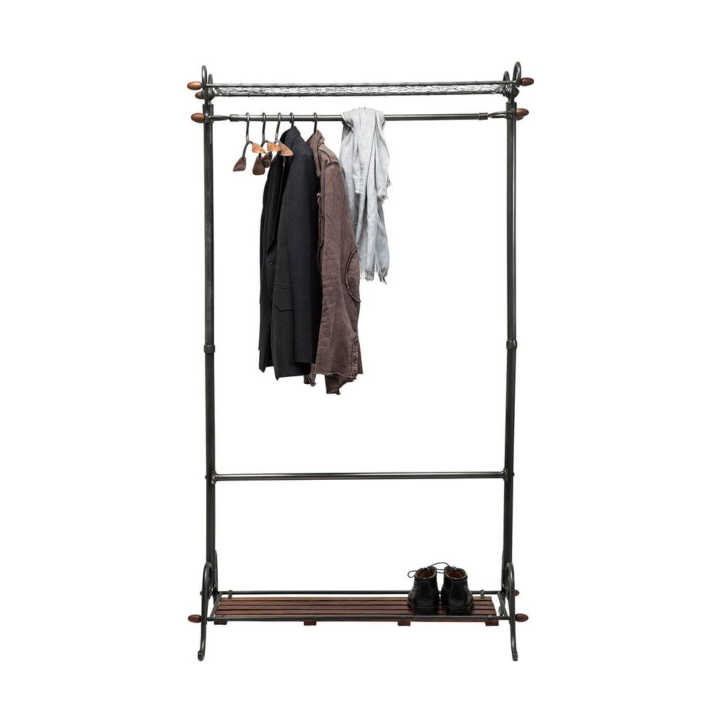 Eine Standgarderobe im Vintage-Stil, gefertigt aus Massivholz und Stahl, mit sorgfältig gearbeiteten Details sowie einer Bügelstange und zwei zusätzlichen Ablagen. Der zeitlose Materialmix aus Holz und Stahl strahlt ein gemütliches Ambiente aus und passt perfekt zum rustikalen Country-Stil oder zum modernen Industrial Loft. Diese praktische Garderobenlösung sorgt für Ordnung im Flur oder im Wartezimmer und bietet ausreichend Platz für Jacken, Mäntel, Schuhe, Schals und Taschen.