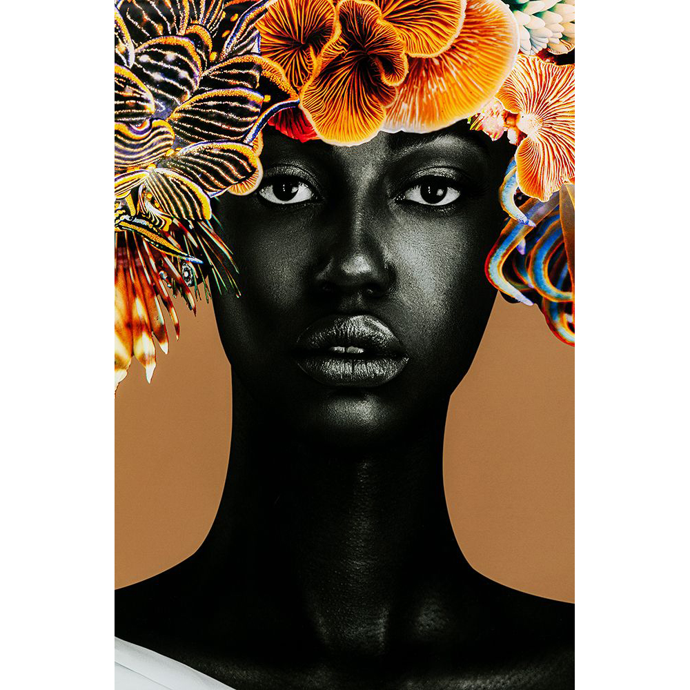 Dieses quadratische Wandbild mit den Maßen 120 x 120 x 3.5 Zentimeter (H/B/T) zeigt ein dekoratives Motiv einer Frau mit Blumen im Haar. Das Bild wurde auf feinem Kunstdruckpapier gedruckt und ist von einem schmalen schwarzen Rahmen aus Aluminium eingefasst. Eine schützende Front aus ESG Sicherheitsglas sorgt für Langlebigkeit und Sicherheit.