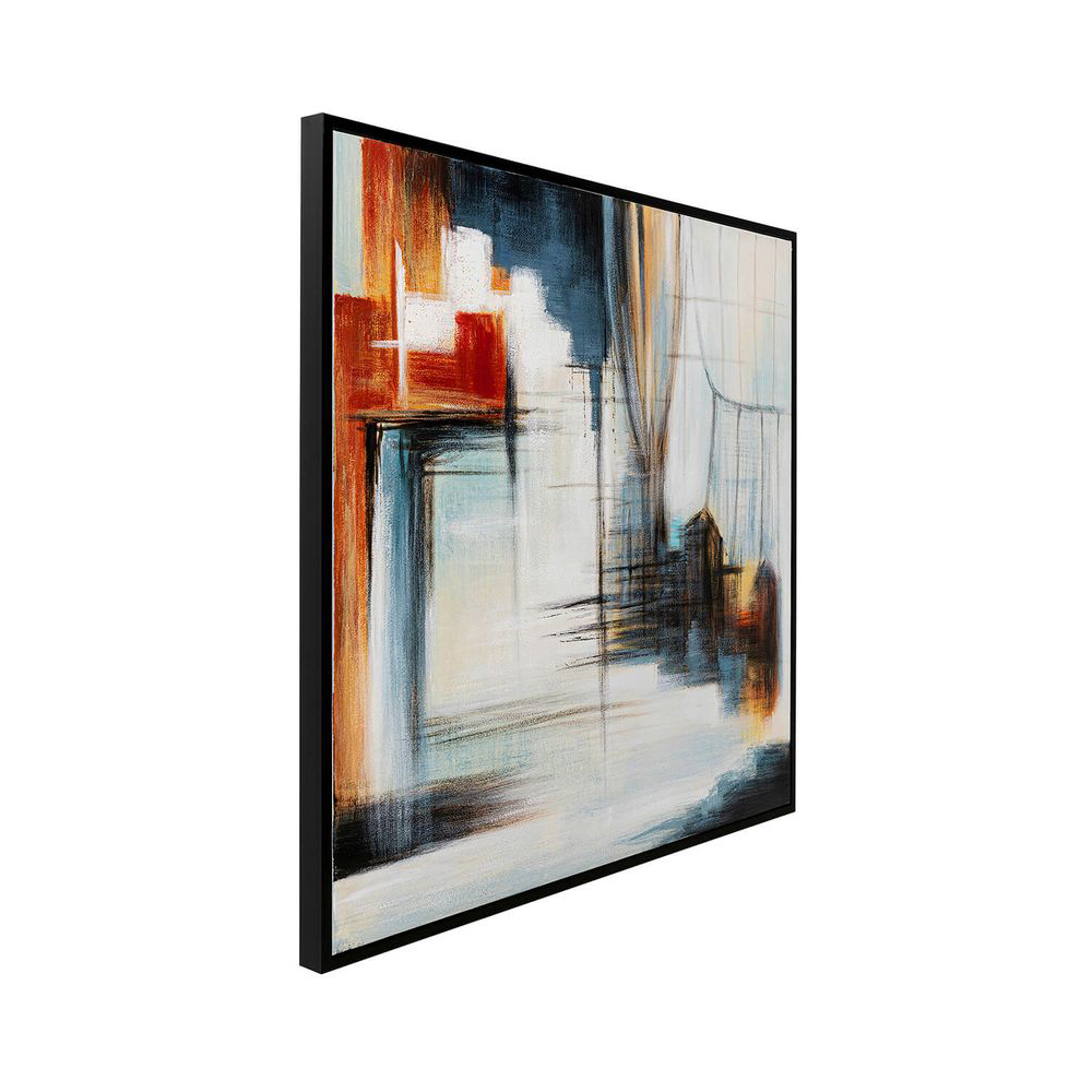 Dieses abstrakte Bild auf Leinwand wird mit einem eleganten Rahmen geliefert. Jedes Stück ist ein individuelles Unikat, das von Hand gemalt wurde. Das abstrakte Design zeigt eine Kombination aus Rot, Blau, Weiß, Gelb und Schwarz. Der hochwertige schwarze Rahmen verleiht dem Bild eine edle Note.