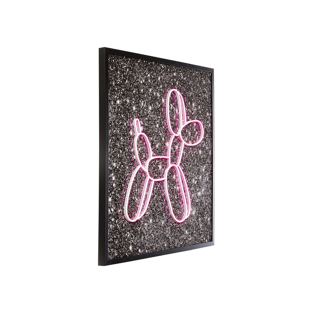 Dieses LED-Glasbild zeigt einen rosafarbenen Ballonhund. Der Lampenschirm besteht aus Acrylnitril-Butadien/Acryl, während der Rahmen aus Polystyrol gefertigt ist. Mit einer Kabellänge von 80 cm ist es für die horizontale Wandmontage geeignet. Ein Kippschalter befindet sich am Kabel, das kunststoffummantelt ist.