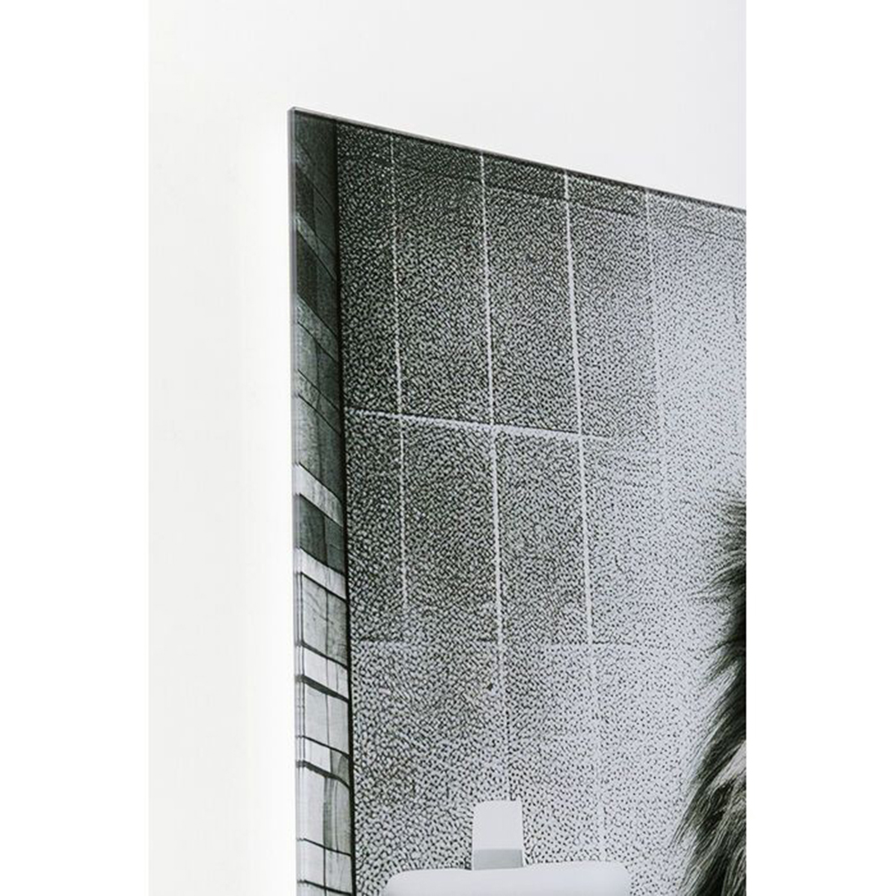 Das Glasbild präsentiert ein humorvolles Löwenmotiv. Hergestellt aus 4 mm dickem Sicherheitsglas (ESG), das foliert ist, eignet es sich für die vertikale Wandmontage.
