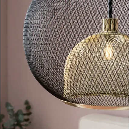 Unsere runde Hängeleuchte aus Drahtgeflecht ist ein Beispiel für schlichte Schönheit. In der Farbkombination Schwarz und Gold verleiht sie jedem Raum einen eleganten Touch. Ob als einzelne Leuchte im langen Flur oder als Gruppe von drei Leuchten neben dem Sofa - diese Hängeleuchte ist ein echter Blickfang. Das filigrane Design des Leuchtenschirms verleiht der Lampe eine optische Leichtigkeit und sorgt für ein angenehmes Lichtspiel im Raum. Sie eignet sich perfekt für den Esstisch, die Küche oder den Flur. Gestalten Sie Ihre Grato Leuchte ganz individuell, indem Sie ein Leuchtmittel Ihrer Wahl einsetzen. So können Sie den Look der Lampe nach Ihren persönlichen Vorlieben gestalten.