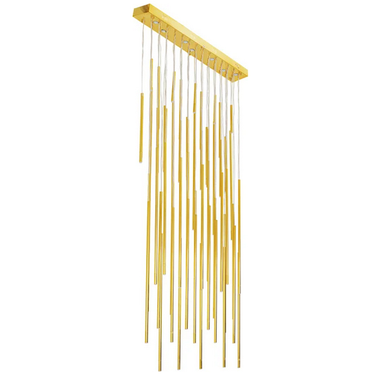 Unsere XL-Hängeleuchte ist aus Edelstahl gefertigt und mit einer Messingbeschichtung versehen. Mit ihren Maßen von 320 x 154 x 21 cm (H/B/T) hat sie ein modernes und minimalistisches Design mit filigranen Schirmen. Sie eignet sich perfekt für hohe Räume oder kann als optischer Raumteiler verwendet werden. Die Höhe der Leuchte ist von 250 bis 320 cm verstellbar. Im Lieferumfang sind LED-Leuchtmittel enthalten, die problemlos ausgetauscht werden können.