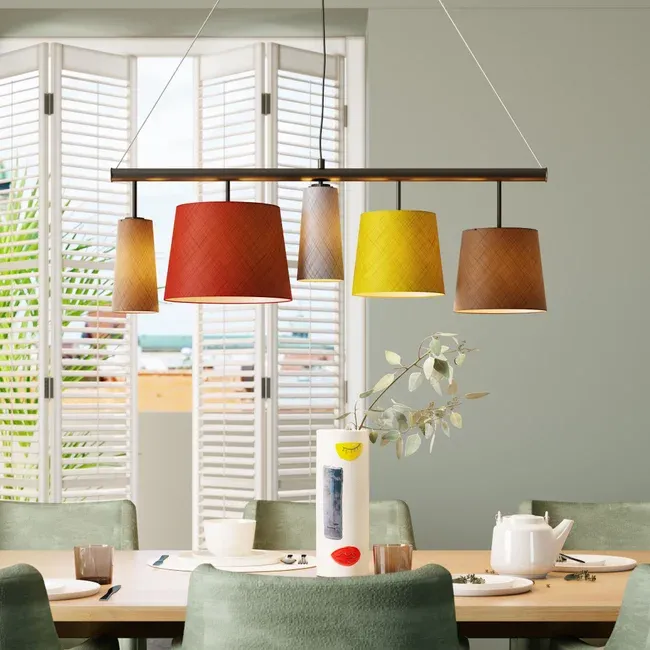 Zauberhafte Hängeleuchte mit fünf verschiedenen, farbigen Leuchtenschirmen - ein Style-Garant! Die Hängeleuchte ist perfekt geeignet, um über dem Esstisch oder dem Küchentresen angebracht zu werden, da sie ihr Licht nach unten abstrahlt. Sie ist anpassungsfähig an jede Einrichtung, aber gleichzeitig außergewöhnlich genug, um die Blicke auf sich zu ziehen. Die fünf Leuchtenschirme in den warmen Farben Beige, Braun, Weinrot, Schwarz und Gelb sorgen für ein gemütliches Licht. Die Hängeleuchte benötigt drei E27-Leuchtmittel und zwei E14-Leuchtmittel mit einer Spannung von 230 V und einer maximalen Leistung von 25 Watt. Die Leuchtmittel sind nicht im Lieferumfang enthalten.