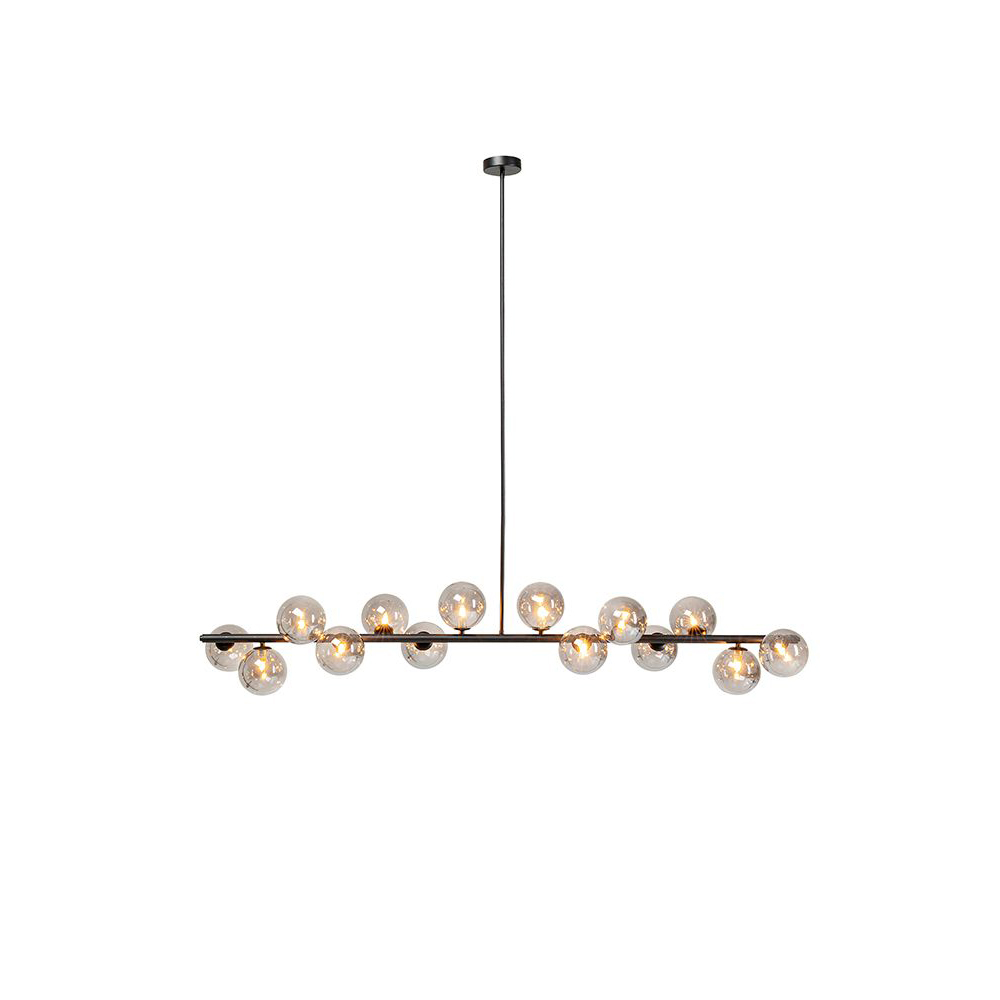 Die Hängeleuchte Scala Balls Schwarz 155cm besticht durch ihr schwarzes Gestell und die 14 Leuchtenschirme aus Glas, die wie Satelliten um die Deckenleuchte kreisen. Der Clou liegt in der transparenten metallischen Beschichtung des Glases, die für eine besondere Lichtstreuung sorgt. Diese breite Hängelampe eignet sich perfekt, um über einem großen Esstisch im Esszimmer platziert zu werden und ist aus verschiedenen Perspektiven eine wahre Schönheit, die große Räume auf außergewöhnliche Weise erhellt. Lichtdesigner empfehlen 3 bis 5 Lichtquellen für größere Räume, wobei eine davon indirektes Licht streuen sollte - genau wie diese Lampe.