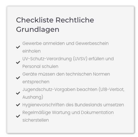 Die rechtlichen Anforderungen sind klar definiert und dienen in erster Linie dem Schutz der Kunden. Jeder Betrieb muss beim zuständigen Gewerbeamt angemeldet werden. Zusätzlich ist die UV-Schutz-Verordnung einzuhalten, die nicht nur die technische Beschaffenheit der Geräte regelt, sondern auch die Schulung des Personals und die Informationspflicht gegenüber den Kunden. Geräte müssen den geltenden Normen entsprechen und regelmäßig gewartet werden.