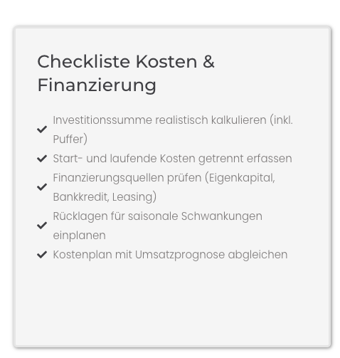 Zur besseren Übersicht lassen sich die wichtigsten Investitionsposten in zwei Gruppen unterteilen: einmalige Anschaffungskosten wie Geräte, Umbauten, Möbel und Marketingkampagnen zum Start, und laufende Kosten wie Miete, Strom, Wartung, Versicherungen und Gehälter. Besonders in der Anfangsphase ist es sinnvoll, finanzielle Rücklagen einzuplanen, um schwächere Monate – typischerweise im Sommer – abzufedern.