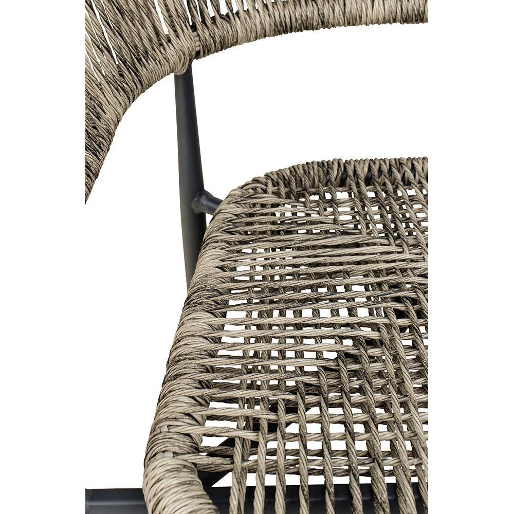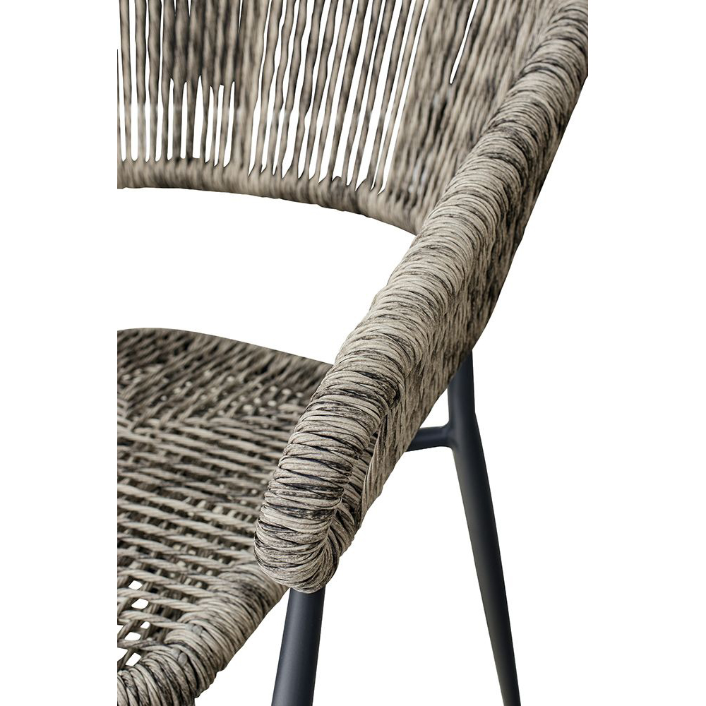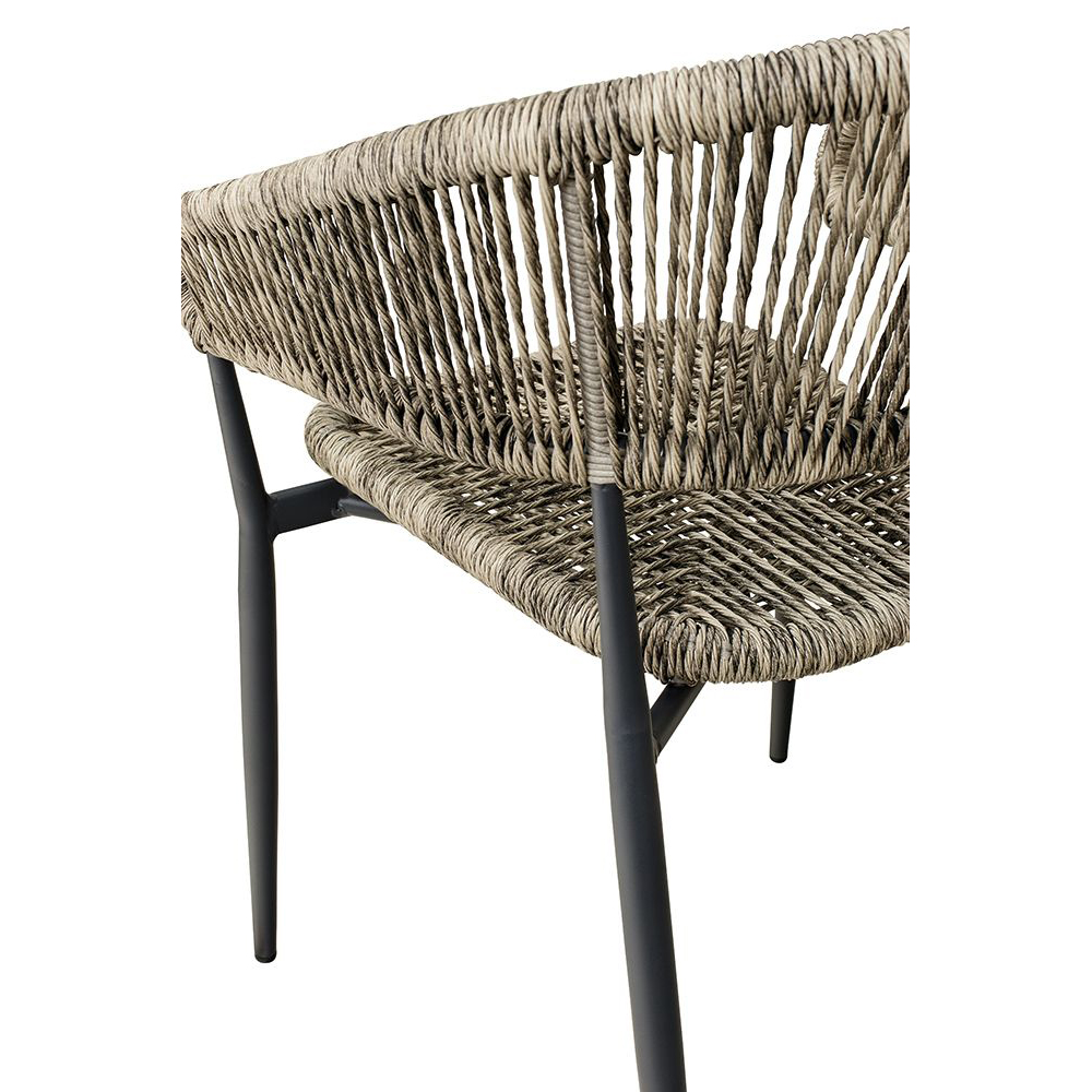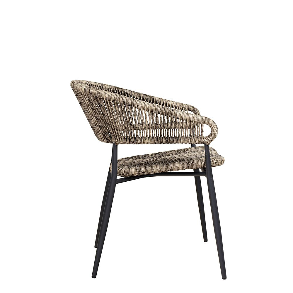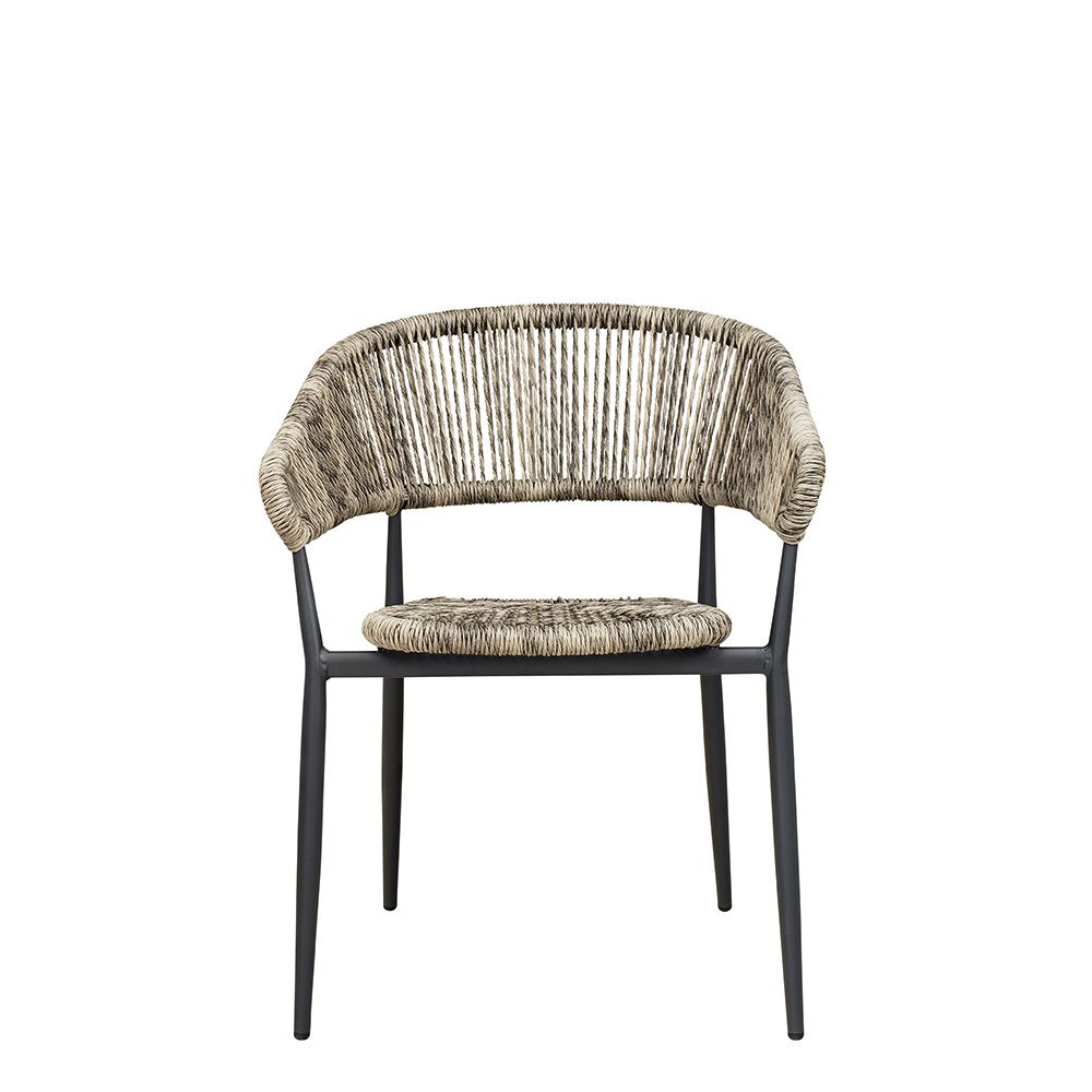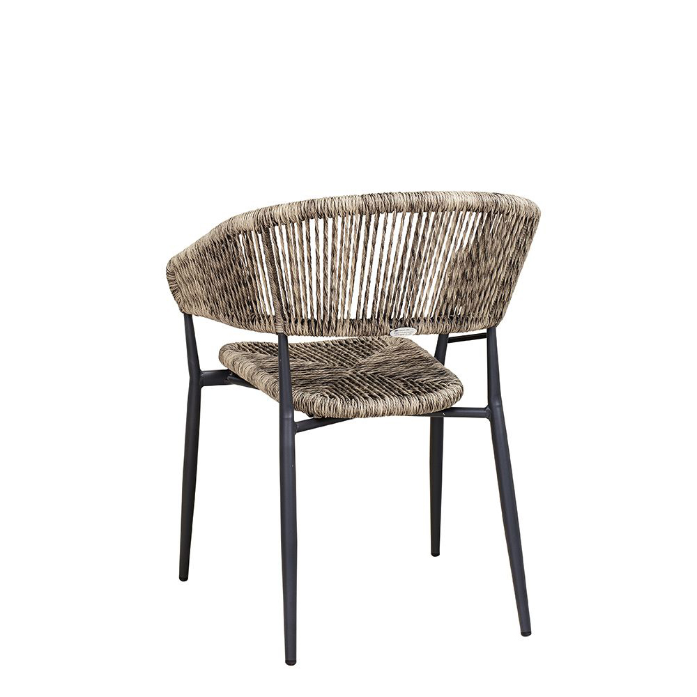 Ein Terrassenstuhl mit Armlehnen für höheren Sitzkomfort. Sitz und Rücken sind mit strapazierfähigen, witterungsbeständigem und pflegeleichtem Outdoorseil bespannt. Das Seil ist schnell trocknend. Der Stuhl ist stapelbar.