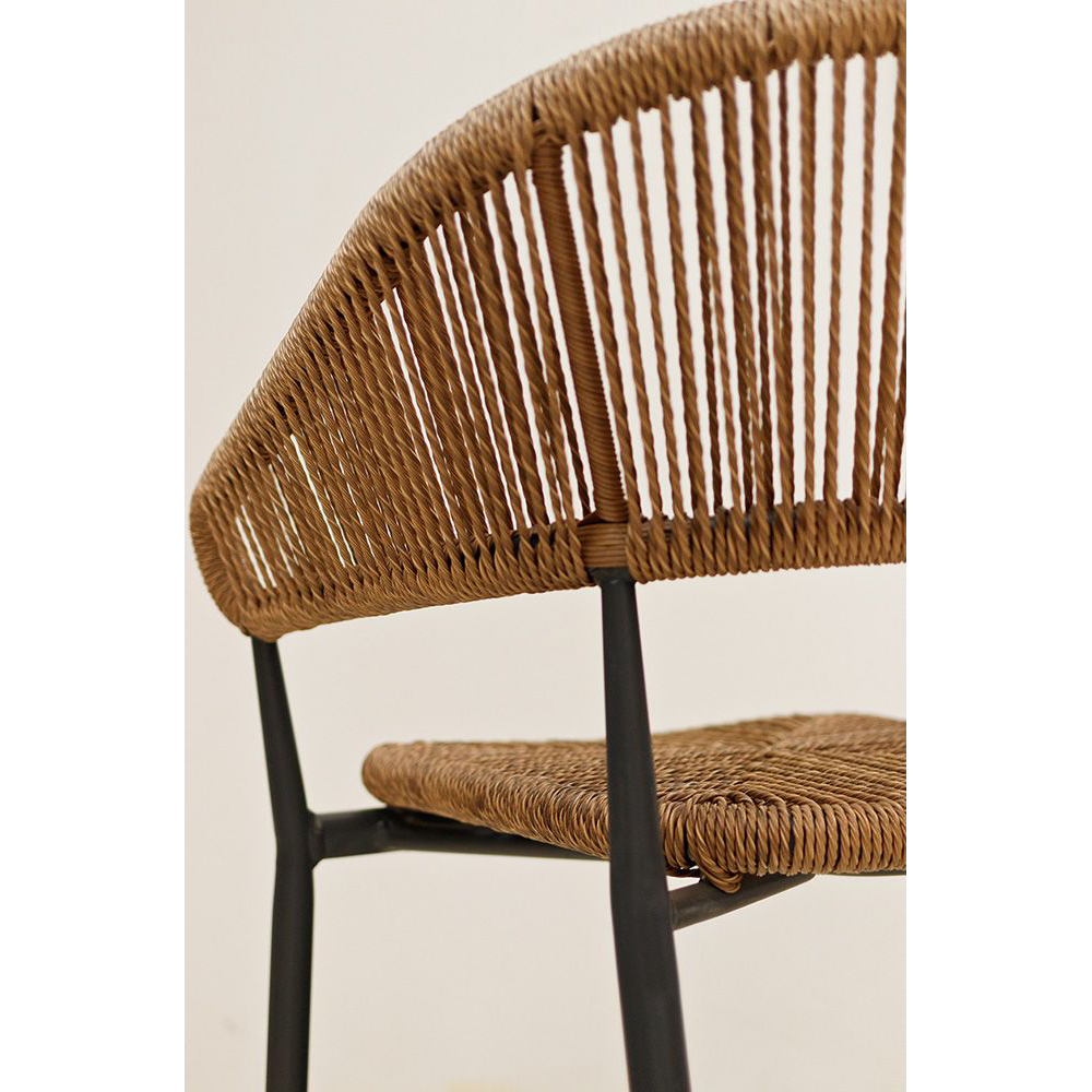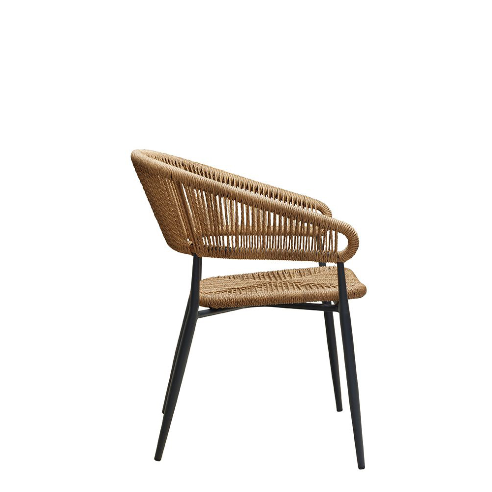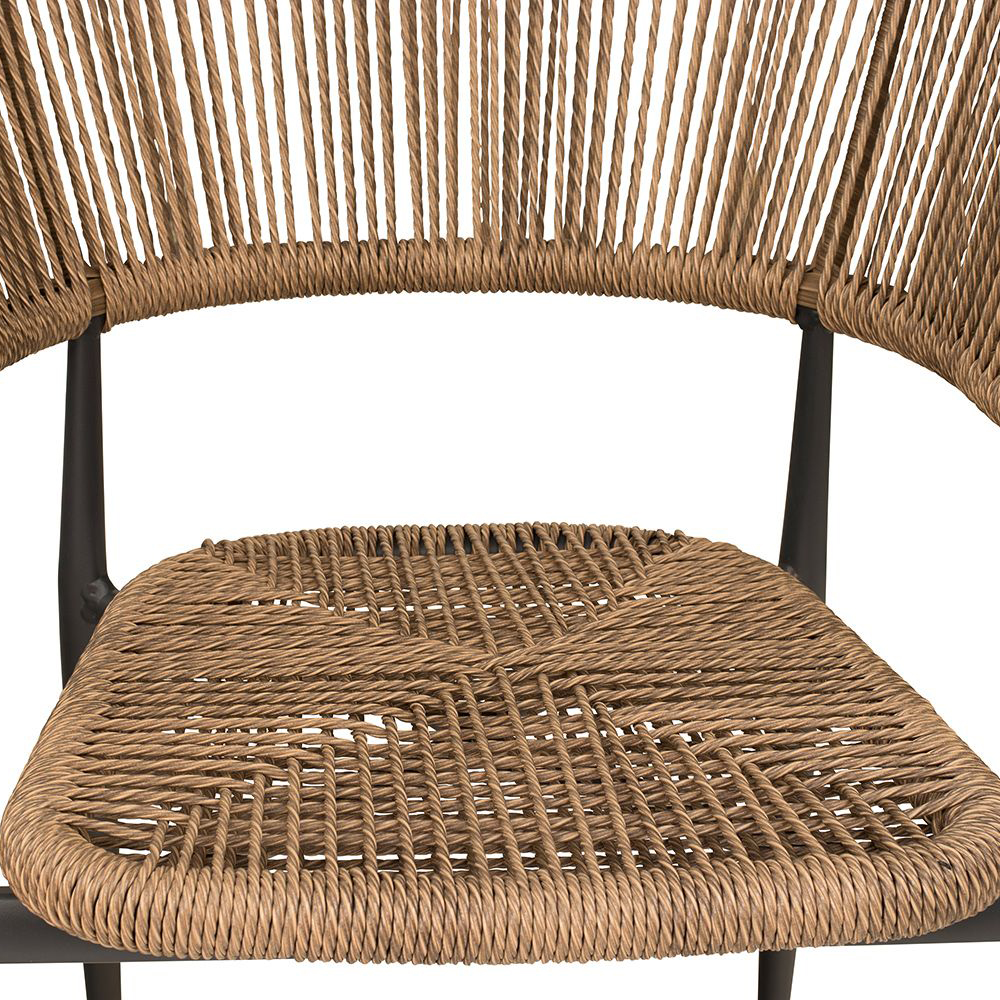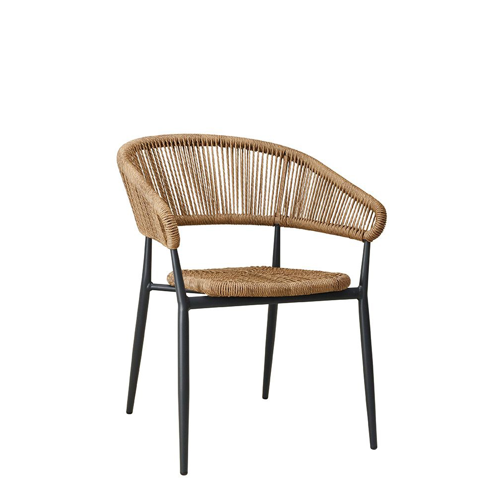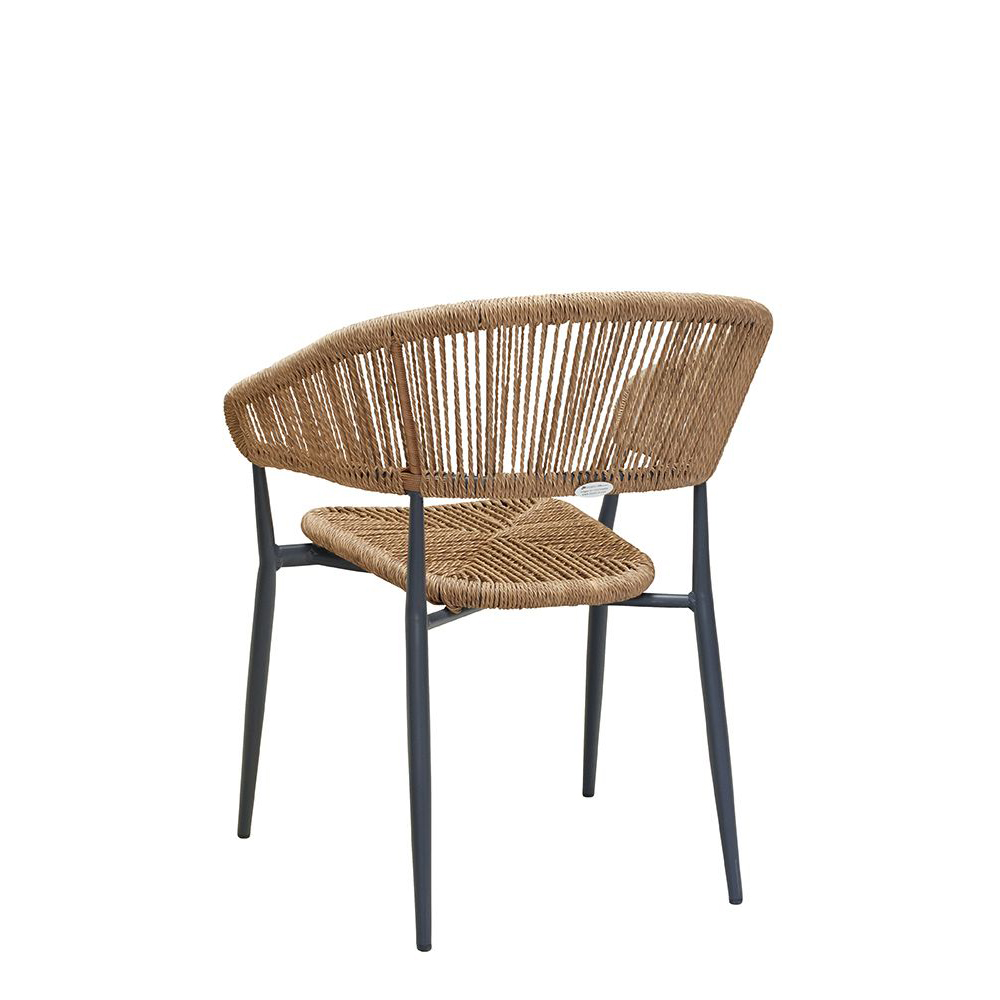 Ein Terrassenstuhl mit Armlehnen für höheren Sitzkomfort. Sitz und Rücken sind mit strapazierfähigen, witterungsbeständigem und pflegeleichtem Outdoorseil bespannt. Das Seil ist schnell trocknend. Der Stuhl ist stapelbar.