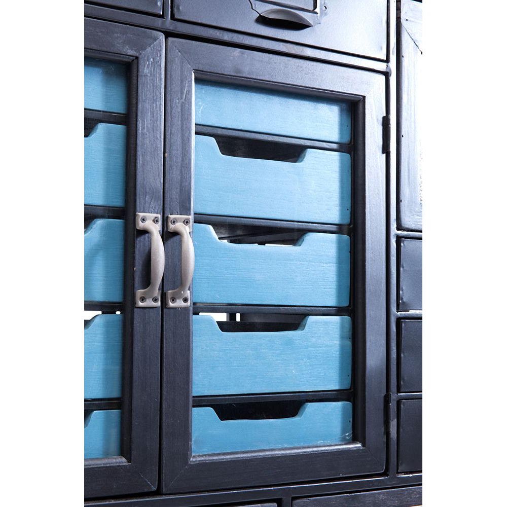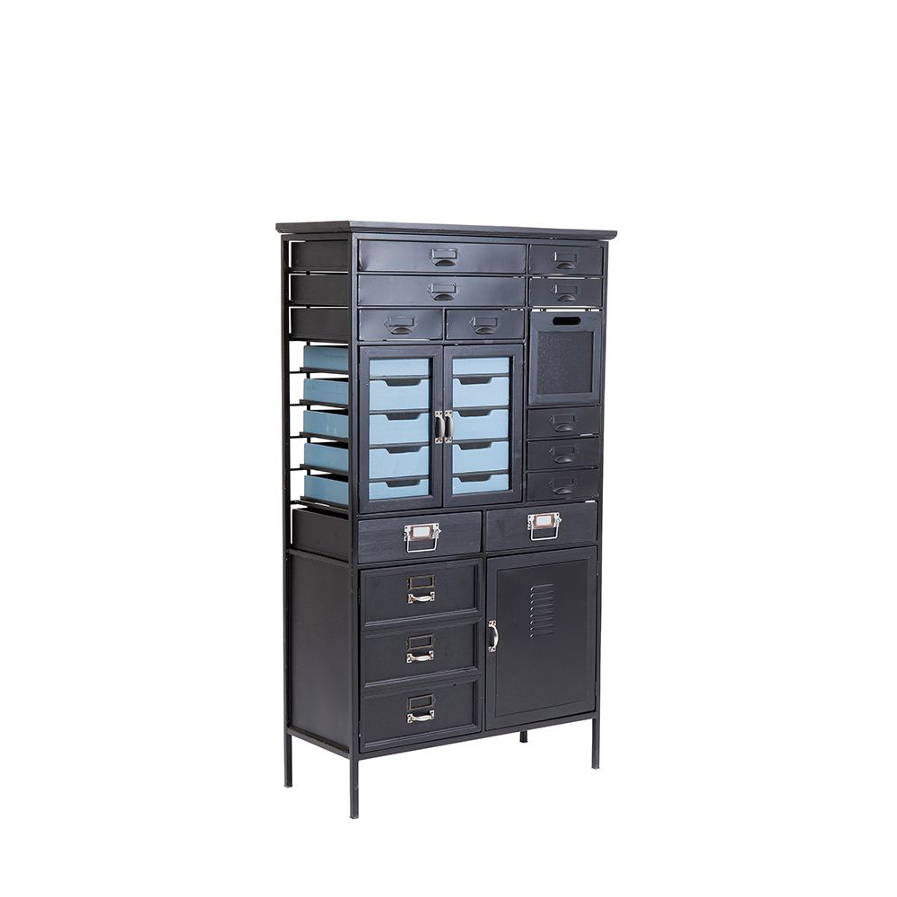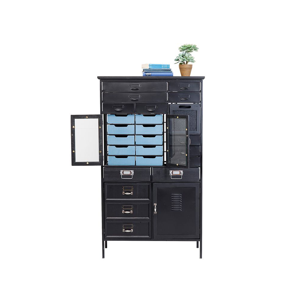 Der hohe Schubladenschrank mit schwarz lackierten Fronten aus Stahl und zahlreichen liebevollen Details verströmt einen herrlich altmodischen Charme, ist jedoch so praktisch und durchdacht wie ein modernes Highboard. Die charmanten Metallgriffe im Retro-Stil runden das Gesamtbild perfekt ab und verleihen dem Schrank einen einzigartigen Look.