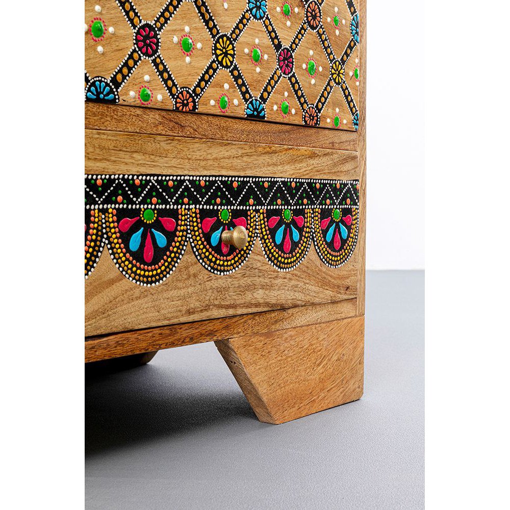 Die Kommode "Menorca" in den Maßen 79,5 x 115 x 36 Zentimeter (H/B/T) besteht aus braunem Mango-Massivholz und verfügt über verzierte Fronten. Die bunten Muster auf den Schubladenfronten wurden liebevoll von Hand gemalt, was jedes Stück zu einem Unikat macht. Mit insgesamt 14 Schubladen bietet das Sideboard ausreichend Stauraum für Ihre persönlichen Gegenstände.