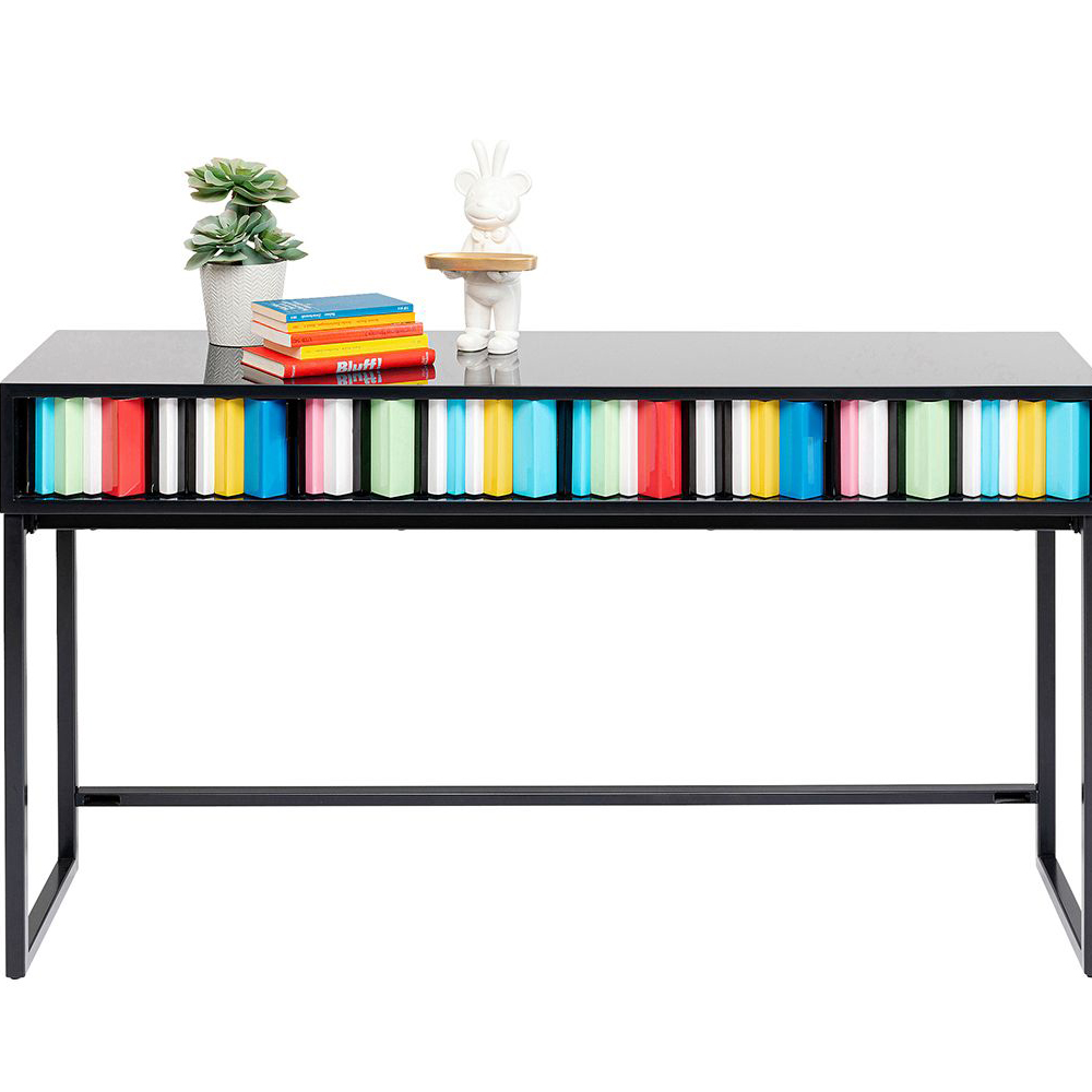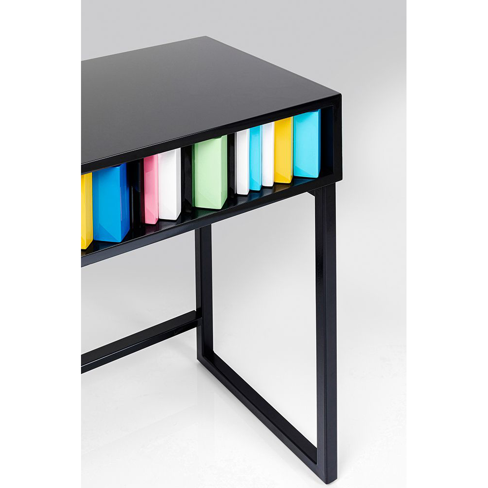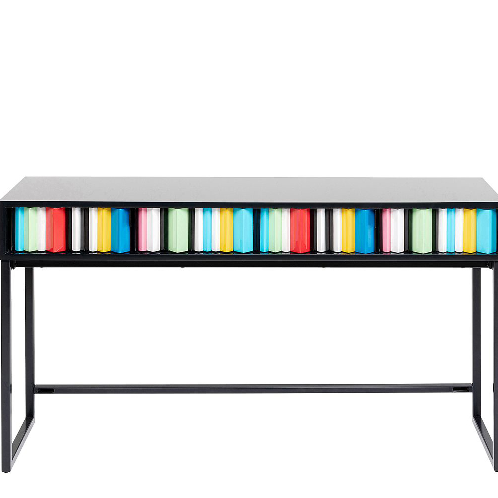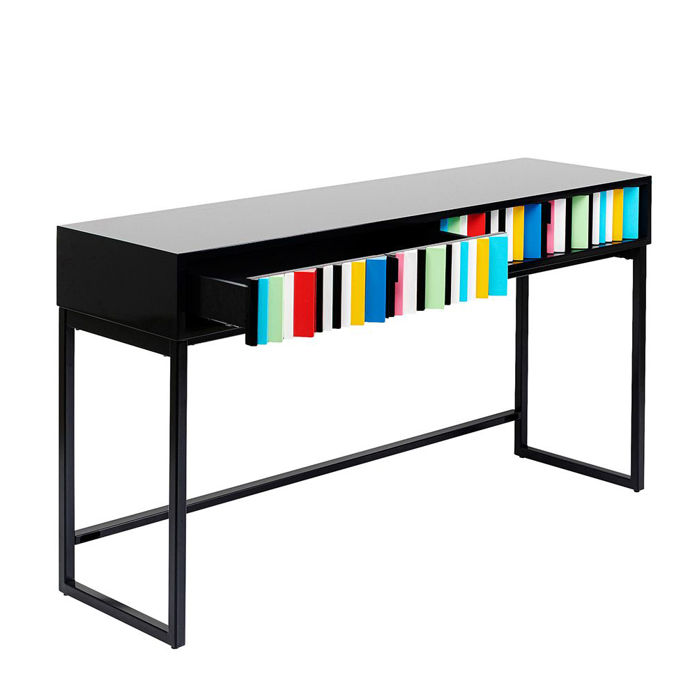Die Konsole "Concertina Colore" in den Maßen 78 x 135,5 x 40 Zentimeter (H/B/T) ist ein Designer-Möbelstück von Morten Georgsen. Diese schwarze Konsole mit bunter Front besticht durch ihr modernes Design und ihre praktische Funktionalität. Die zwei Schubladen mit plastischen Fronten und schmalen, schwarzen Griffleisten aus lackiertem Stahl bieten ausreichend Stauraum für verschiedene Gegenstände.