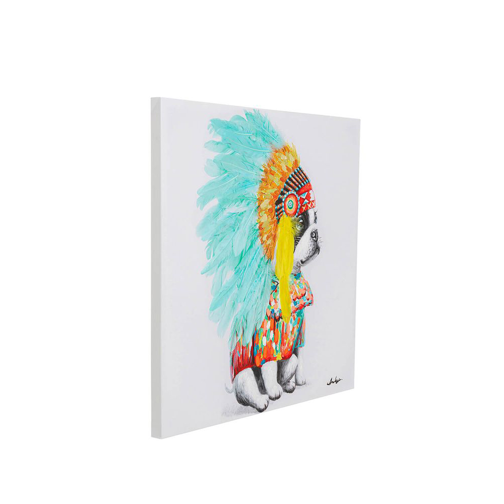 Eine humorvolle Deko-Idee ist dieses quadratische Wandbild mit einem Hundmotiv. Es wurde handgefertigt und mit echten Federn in den Farben Türkis und Gelb verziert. Diese bunte Wanddekoration ist ideal für jeden Raum und besteht aus Acrylmalerei auf Leinwand, montiert auf einem stabilen Rahmen aus Massivholz.