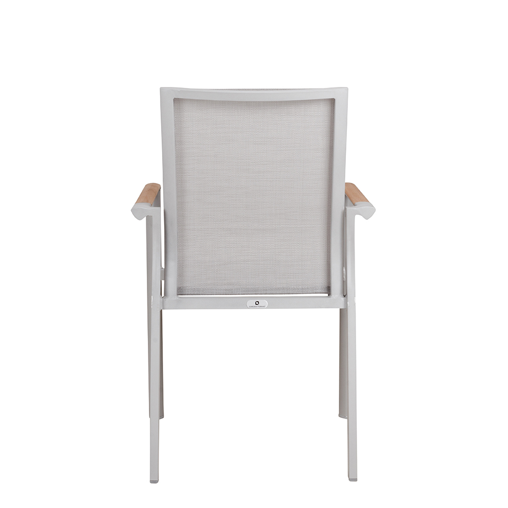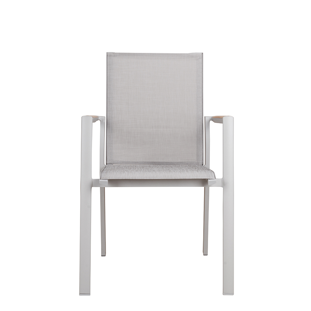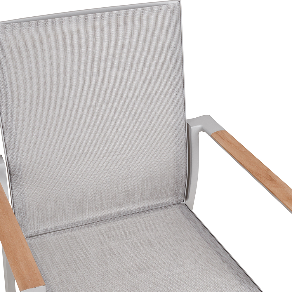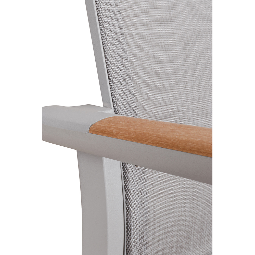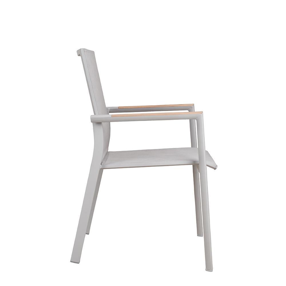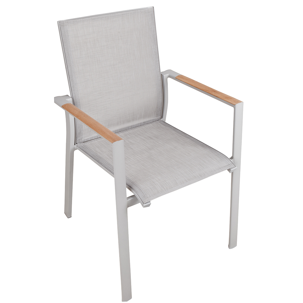 Der Neptun Light Grey ist der funktionale und stilvolle Begleiter für alle Außenbereiche im Gastronomie, Hotellerie und Eventsektor. Mit seinem robusten Aluminium-Gestell und den wetterbeständigen Textylen-Sitz- und Rückenflächen bietet der Stuhl Sitzkomfort und langlebige Qualität. Die eleganten Armlehnen in Teakholz verleihen dem Stuhl eine natürliche Ästhetik und harmonieren mit modernen Outdoor-Designs. Dank der Stapelbarkeit und des leichten Gewichts von nur 3,8 kg ist der Neptun Light Grey äußerst praktisch in der Handhabung und ermöglicht einen schnellen, platzsparenden Einsatz.