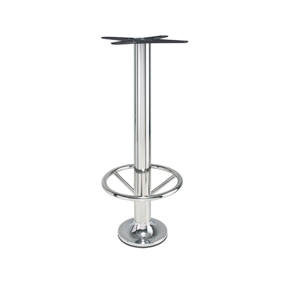 Ein Chrom-Tischgestell mit runder Bodenplatte für Tischplatten bis zu einem Durchmesser von 80 cm. Der Fuß muss am Boden verschraubt werden.