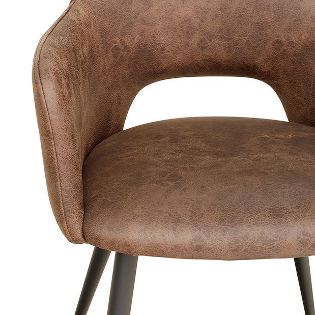 Der gepolsterte Stuhl eignet sich für Restaurants, Hotelgastronomie, Bankett- und Lounge-Szenarien sowie für Café-Bereiche. Die Rückenöffnung erleichtert das Verrücken und unterstützt die zügige Reinigung zwischen den Servicezeiten. Der Stoff imitiert die Optik von Leder und schafft extra Gemütlichkeit mit natürlichen Farben.