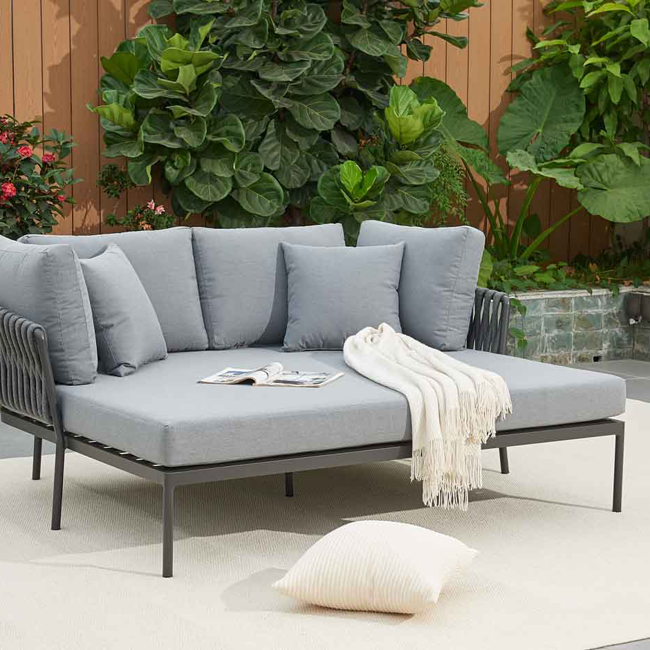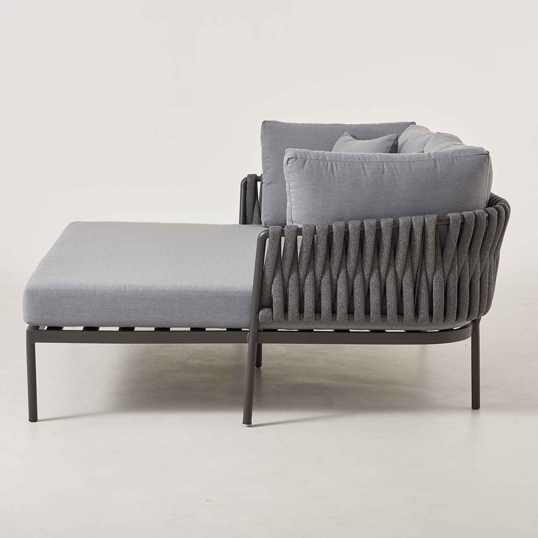 Das Rope Daybed bietet gehobenen Komfort und exklusives Design für den professionellen Outdoor-Bereich. Mit seinem robusten Aluminiumgestell und der komfortablen Liegefläche aus Schaumpolster erfüllt es die hohen Ansprüche von Gastronomiebetrieben, Hotels und Lounges. Die dezente graue Farbgebung sorgt für eine zeitlose Eleganz und lässt sich harmonisch in bestehende Außenbereiche integrieren. Das Daybed ist wetterfest und pflegeleicht, was es zur optimalen Wahl für stark frequentierte Bereiche macht. Ein Highlight für Betriebe, die ihren Gästen ein gehobenes Lounge-Erlebnis bieten möchten.