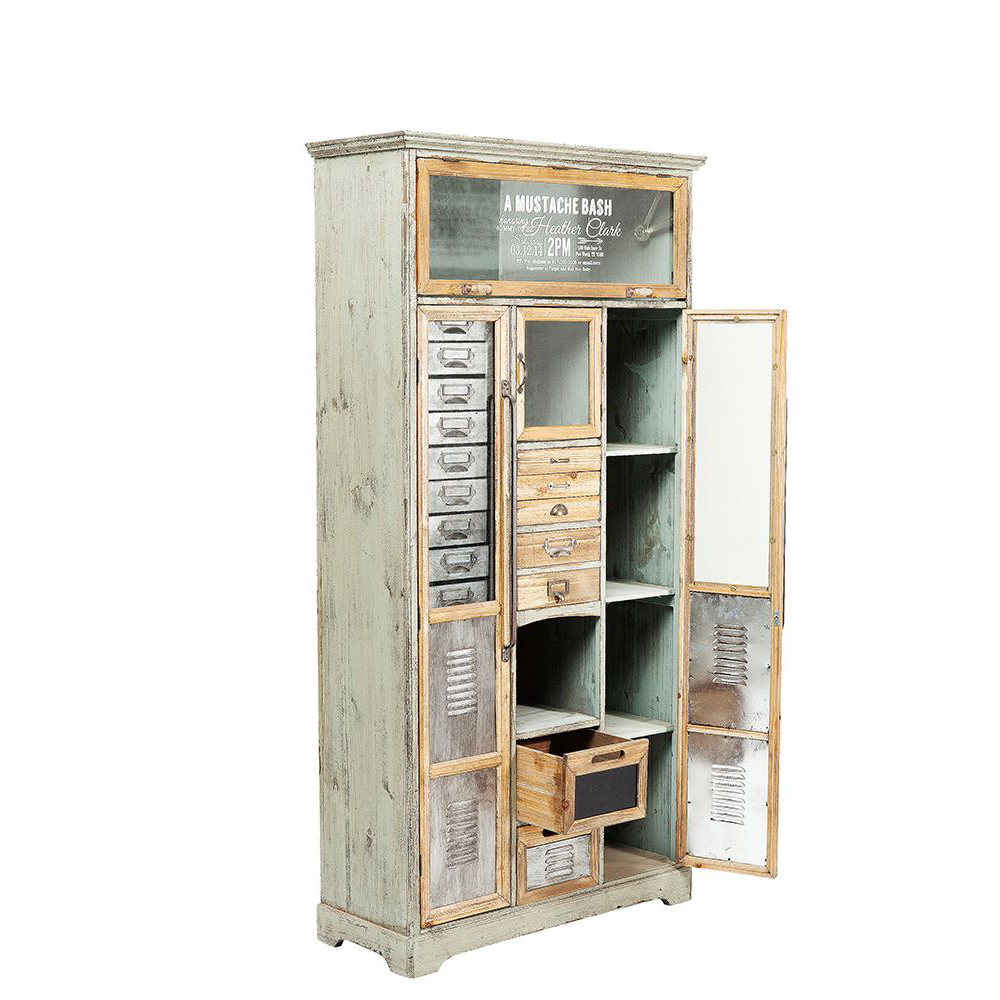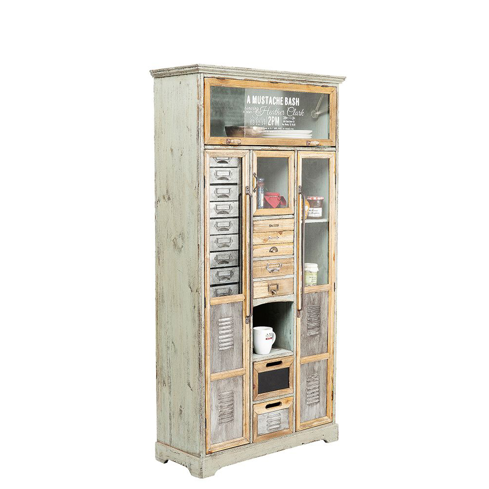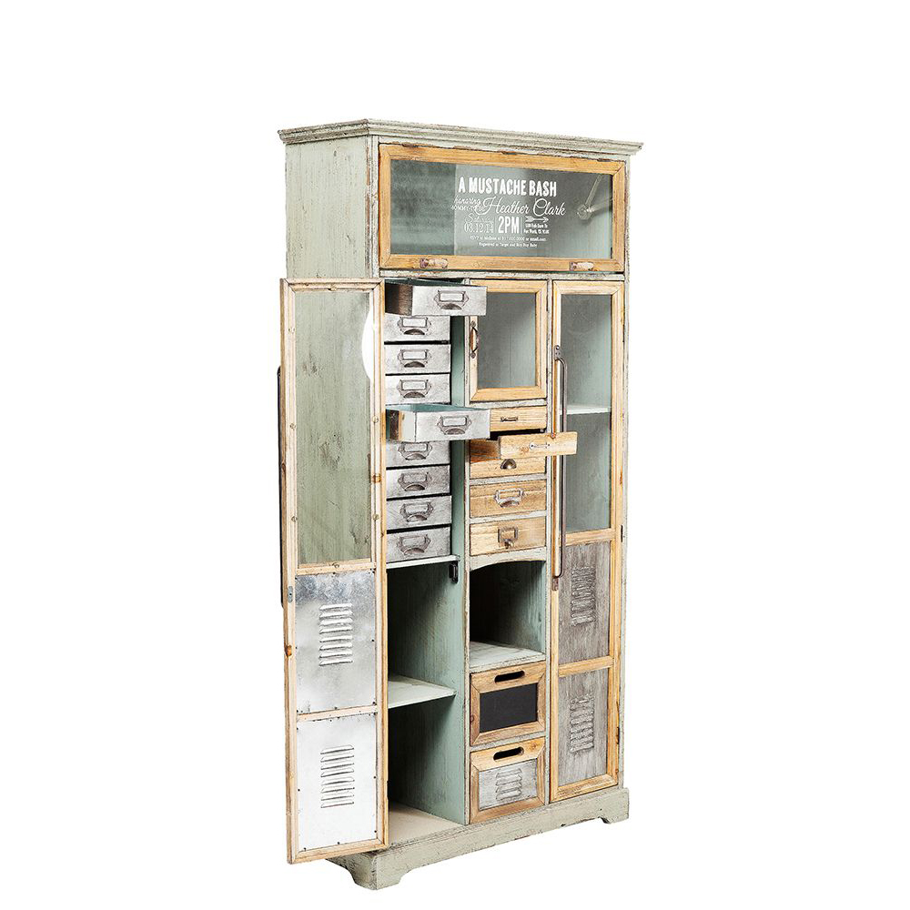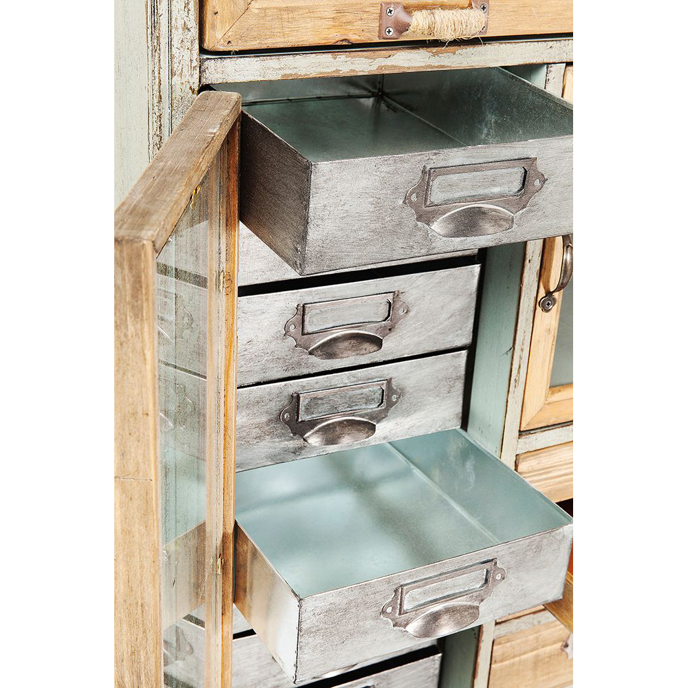 Dieser rechteckige Holzschrank in Mannshöhe verfügt über zahlreiche Fächer und Schubladen, einige davon hinter Glas. Die Fronten und Griffe sind in verschiedenen Varianten gestaltet, was diese individuellen Möbel zu einer echten Rarität macht. Ob für die Küche, das Bad, das Wohn- oder Schlafzimmer, in diesem Schubladenschrank lässt sich alles ordentlich verstauen. Mit insgesamt 14 Schubladen und 11 Ablageflächen ist dieser Schrank ein Traum für Ordnungsfans und bietet reichlich Stauraum für Geschirr, Gläser, Wäsche und vieles mehr. Durch sein Design passt der große Schrank perfekt zum Industrial-Loft-Style, Shabby-Chic und auch ins moderne Landhaus.