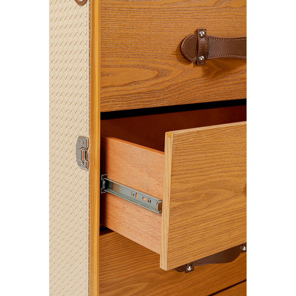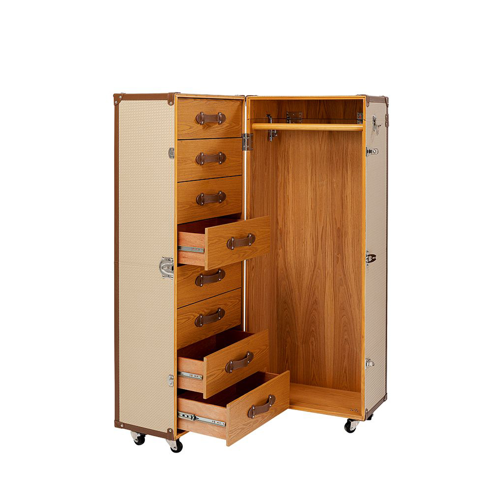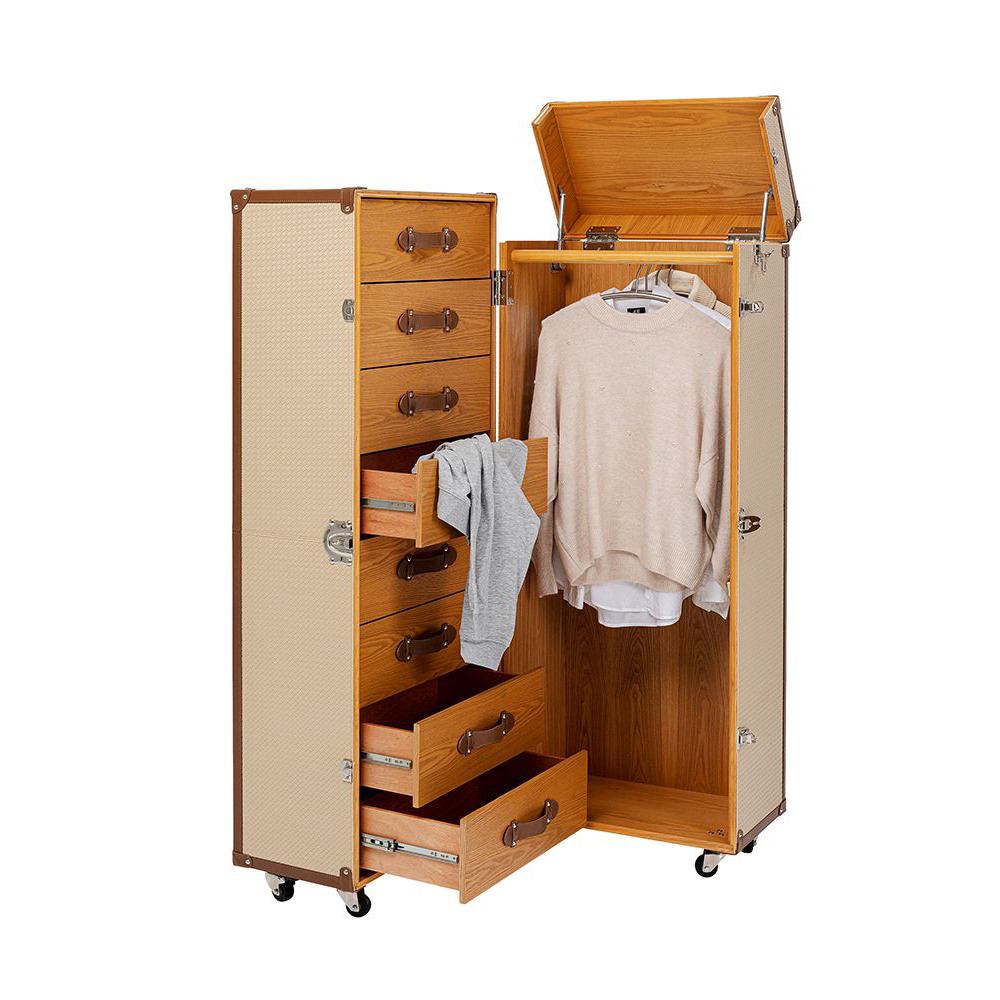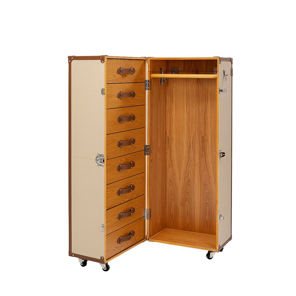 Dieser Schrankkoffer in Beige mit Rollen hat die Maße 155 x 58 x 66 Zentimeter (H/B/T) und ist von klassischen Reisekoffern inspiriert, was sich in vielen authentischen Details widerspiegelt. Im Inneren und auf den Schubladenfronten befindet sich edles Esche-Furnier, das dem Schrank ein hochwertiges Aussehen verleiht. Der Bezug in stilvoller Flechtoptik ist einfach zu reinigen und sorgt für eine ansprechende Optik. Dieser kleine Schrank eignet sich ideal für Schlafzimmer, Gästezimmer und Garderobe und verleiht geschlossen einen wunderbar aufgeräumten Eindruck.