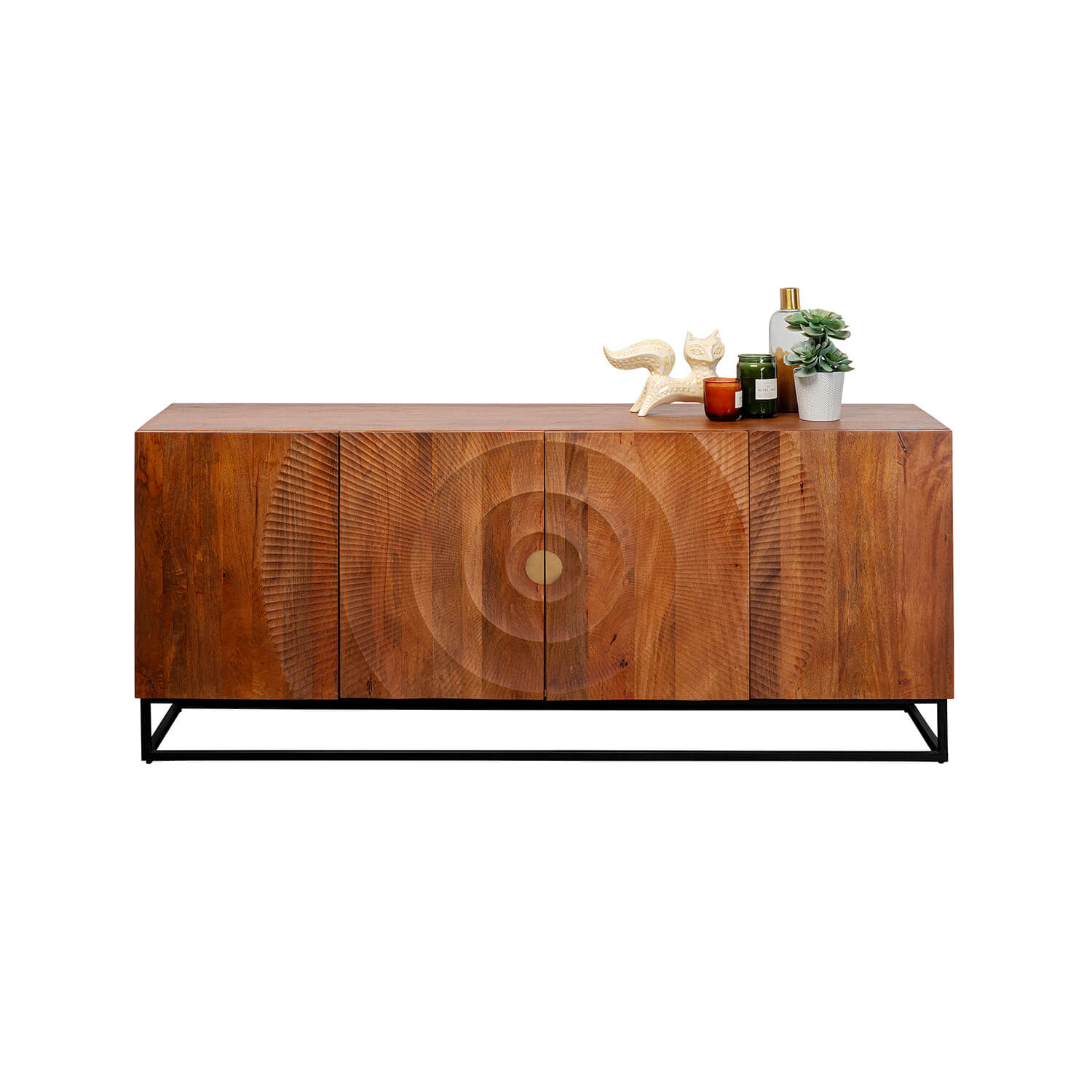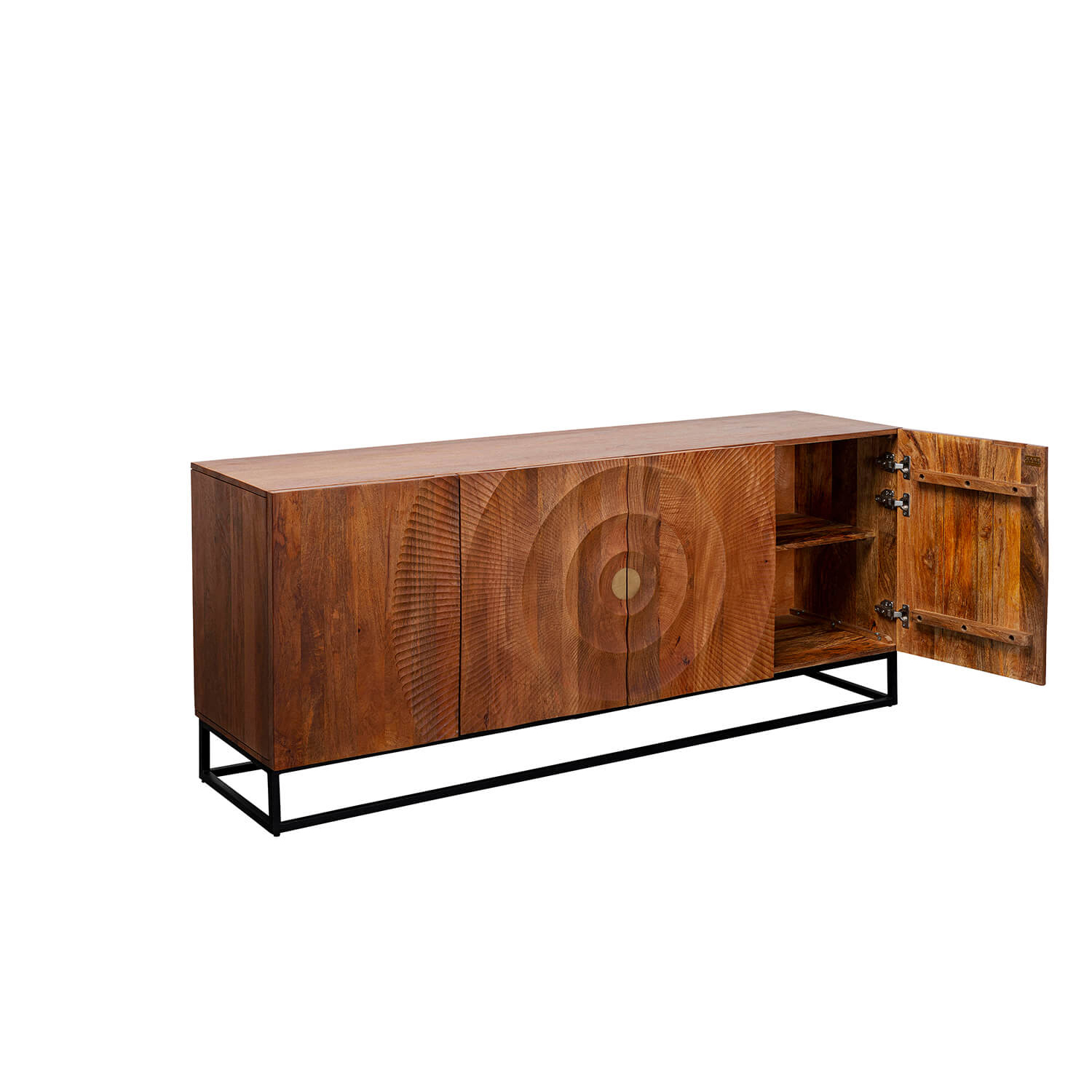 Das Sideboard "Madeira Hell" in den Maßen 177 x 75 Zentimeter ist ein braunes Möbelstück aus Massiv-Holz mit einem schwarzen Gestell. Die plastischen Fronten sind mit geschnitzten Mustern verziert und verleihen dem Sideboard einen einzigartigen Look. Dieses Statement-Möbelstück sorgt mit seinem Wow-Effekt für eine besondere Atmosphäre in Ihrem Wohnbereich.