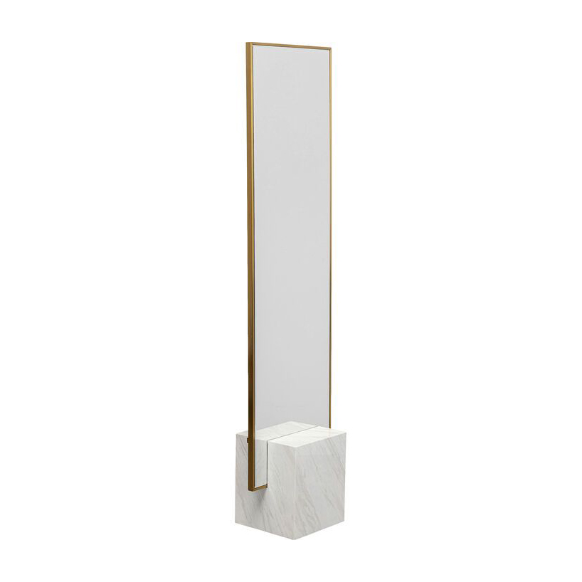 Der Standspiegel "Hulda Messing" in den Maßen 46 x 180 Zentimeter ist ein elegantes und stilvolles Accessoire für Ihr Zuhause. Der Spiegel verfügt über eine verspiegelte Glasfläche und wird von einem Rahmen aus titanbeschichtetem Edelstahl umrandet. Die Rückwand des Spiegels besteht aus mitteldichter Faserplatte und sorgt für Stabilität und Langlebigkeit. Der Standfuß des Spiegels besteht aus Naturstein Marmor und verleiht ihm einen edlen Look.