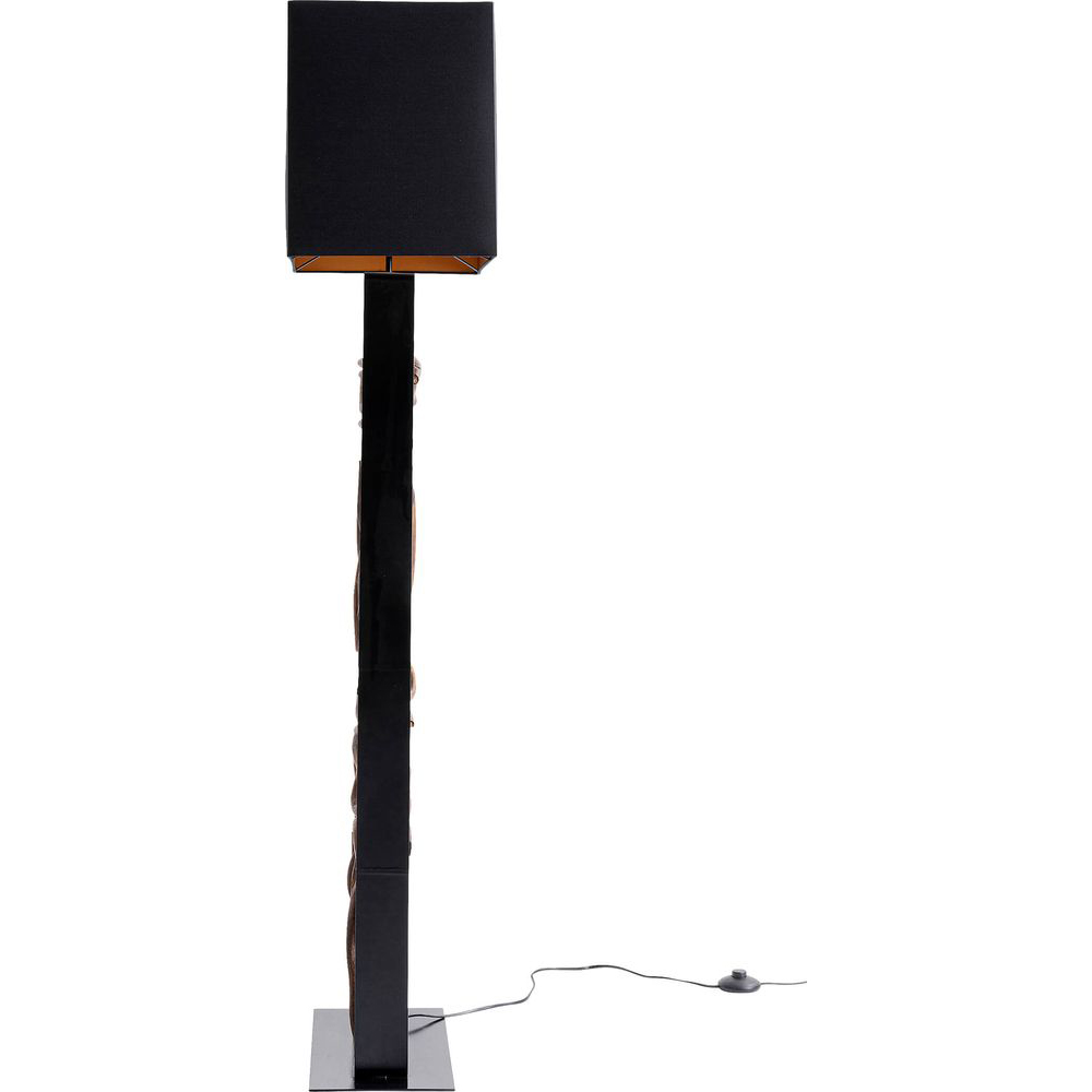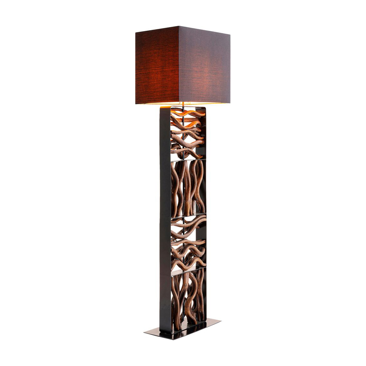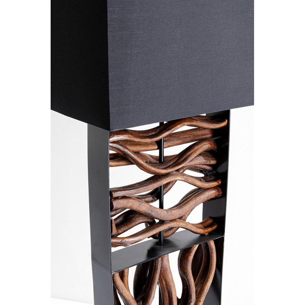 Eine imposante Stehlampe aus schwarzem Stahl mit kunstvoll arrangierten Mosaiken aus Echtholz. Ihr Kontrast zwischen kubischen Formen und verspielter Natürlichkeit verleiht ihr eine skulpturale Präsenz im Raum. Der schwarze Baumwollschirm mit ockerfarbener Innenseite sorgt für warmes Licht. Jedes Stück ist ein Unikat mit natürlich gewachsenen Treibhölzern.