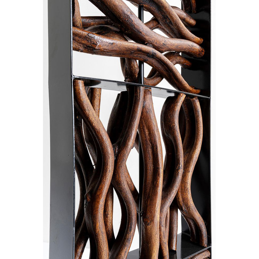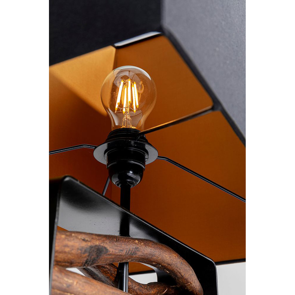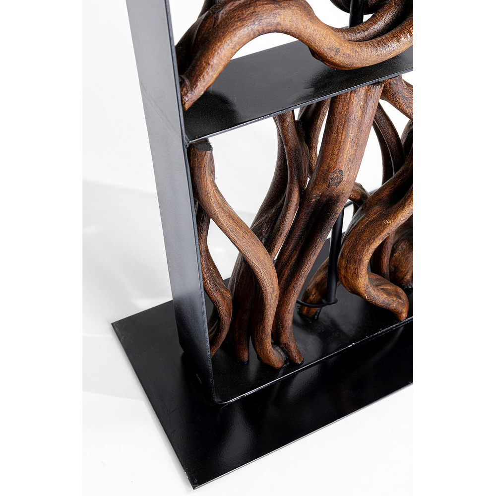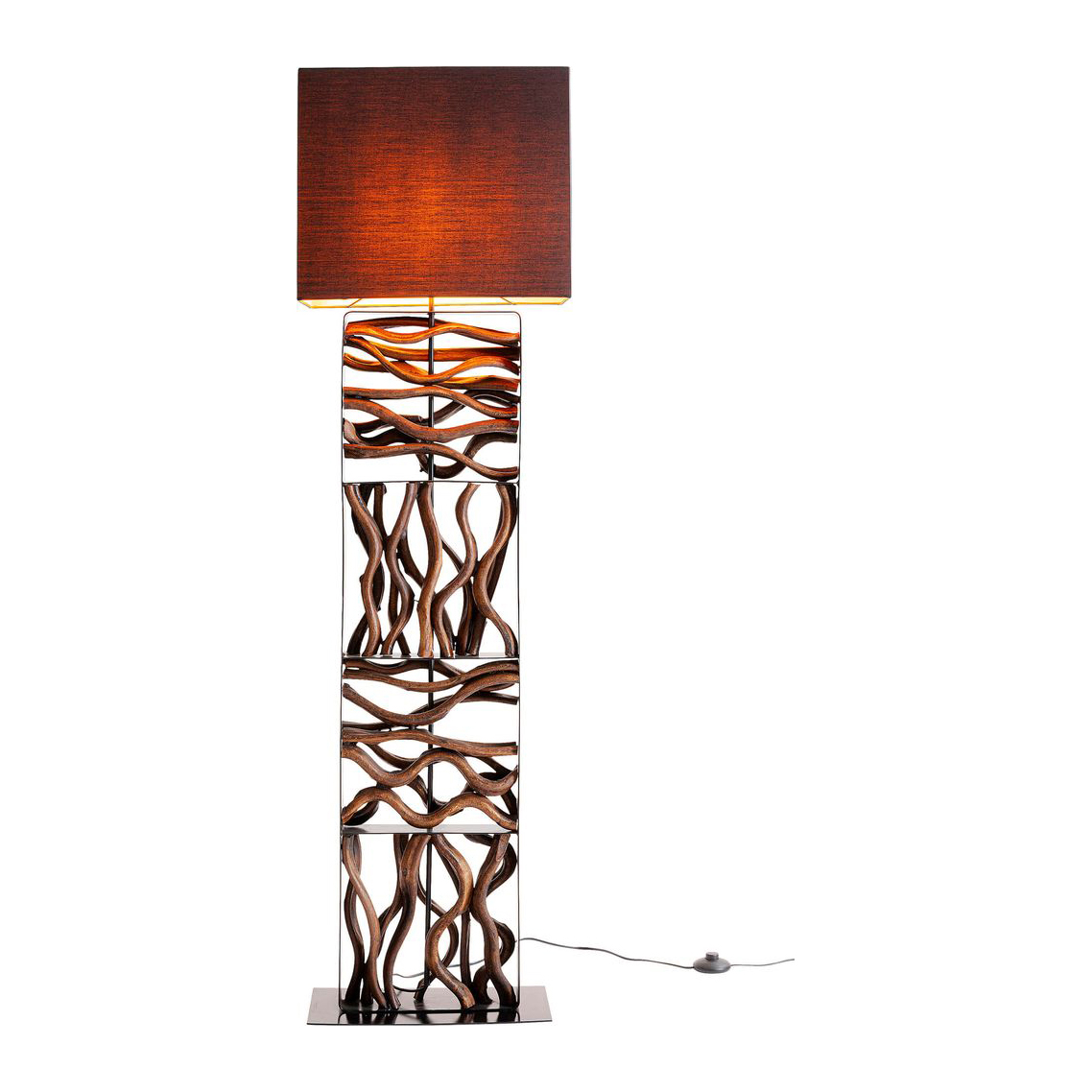 Eine imposante Stehlampe aus schwarzem Stahl mit kunstvoll arrangierten Mosaiken aus Echtholz. Ihr Kontrast zwischen kubischen Formen und verspielter Natürlichkeit verleiht ihr eine skulpturale Präsenz im Raum. Der schwarze Baumwollschirm mit ockerfarbener Innenseite sorgt für warmes Licht. Jedes Stück ist ein Unikat mit natürlich gewachsenen Treibhölzern.