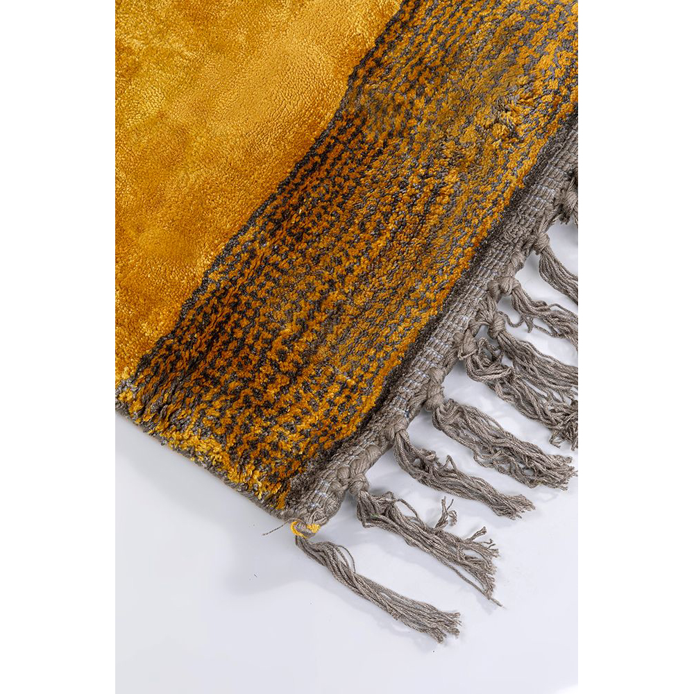 Rechteckiger Viskose-Teppich in der trendigen Farbe Curry mit dezenten Kontraststreifen am schmalen Rand und grauen Fransen. Ein Teppich der Extraklasse: Das Obermaterial aus Viskose schimmert elegant wie Seide und fühlt sich unglaublich weich an. Charakteristisch für Viskoseteppiche: Sie changieren je nach Lichteinfall und Nutzung von hell bis dunkel. Ein handgefertigtes Kunstwerk, dessen Anmutung an Samt erinnert. Die Rückseite ist mit einer Antirutsch-Ausstattung versehen. Um die Schönheit dieses Meisterstücks voll zur Geltung zu bringen, empfehlen wir, es frei vor ein Sofa oder im Raum auszulegen