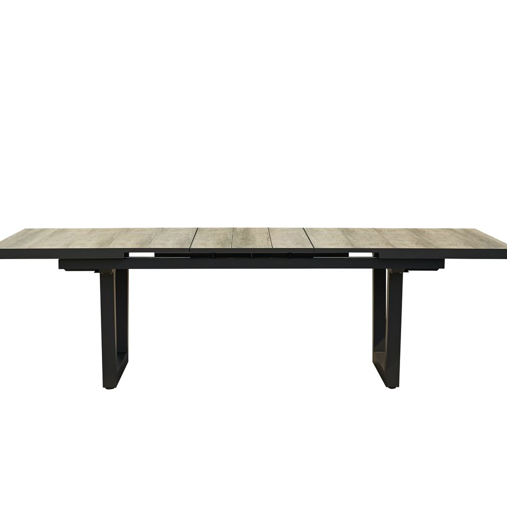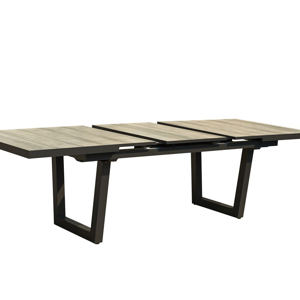 Ein moderner Terrassentisch mit einem robusten Design. Die Tischplatte in einem hellen Farbton bildet einen ansprechenden Kontrast zu den dunklen, geometrisch geformten Tischbeinen.