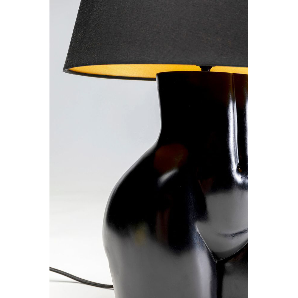 Berührung erwünscht - diese einzigartige Lampe lädt dazu ein, sie zu berühren, dank ihrer harmonischen und runden Formgebung. Die Tischleuchte präsentiert sich eindrucksvoll in einem vollständig schwarzen Design. Der skulpturale Fuß, der einem wohlgeformten Torso ähnelt, verleiht einen künstlerischen Touch. Diese Lampe verleiht jedem Wohnraum Spaß und Individualität. Mit einer Spannung von 230 V, 50/60 Hz und einer E27-Fassung ist sie für ein Leuchtmittel mit einer maximalen Leistung von 40 Watt ausgelegt (Leuchtmittel nicht im Lieferumfang enthalten).
