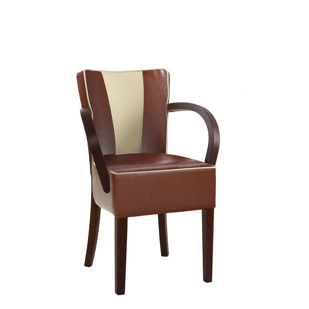 Der Toran-Arm-Stripes ist ein moderner Gastronomiestuhl im amerikanischen Stil. Der Stuhl hat eine gepolsterte Sitz- und Rückenfläche sowie Armlehnen aus Holz. Besonders schön wirkt der Vollpolsterstuhl durch seine Kontrastnähte.