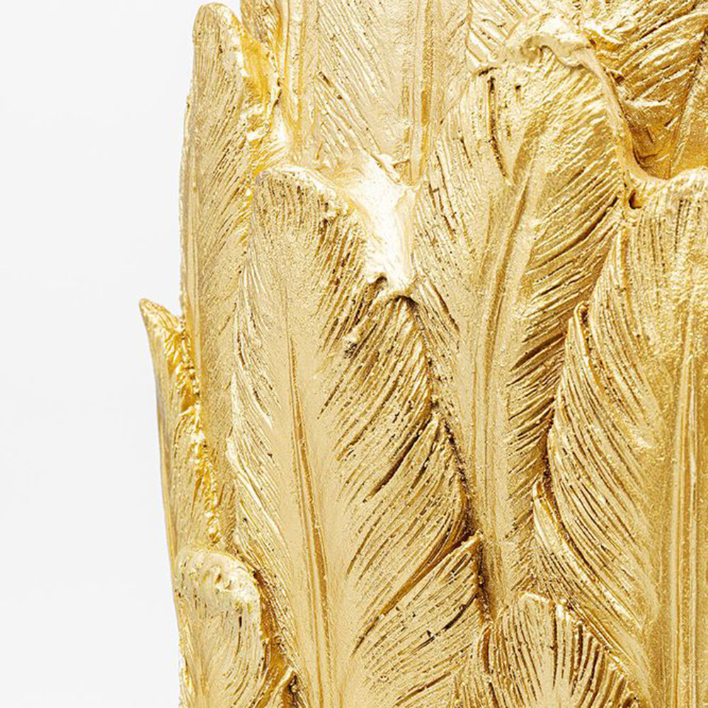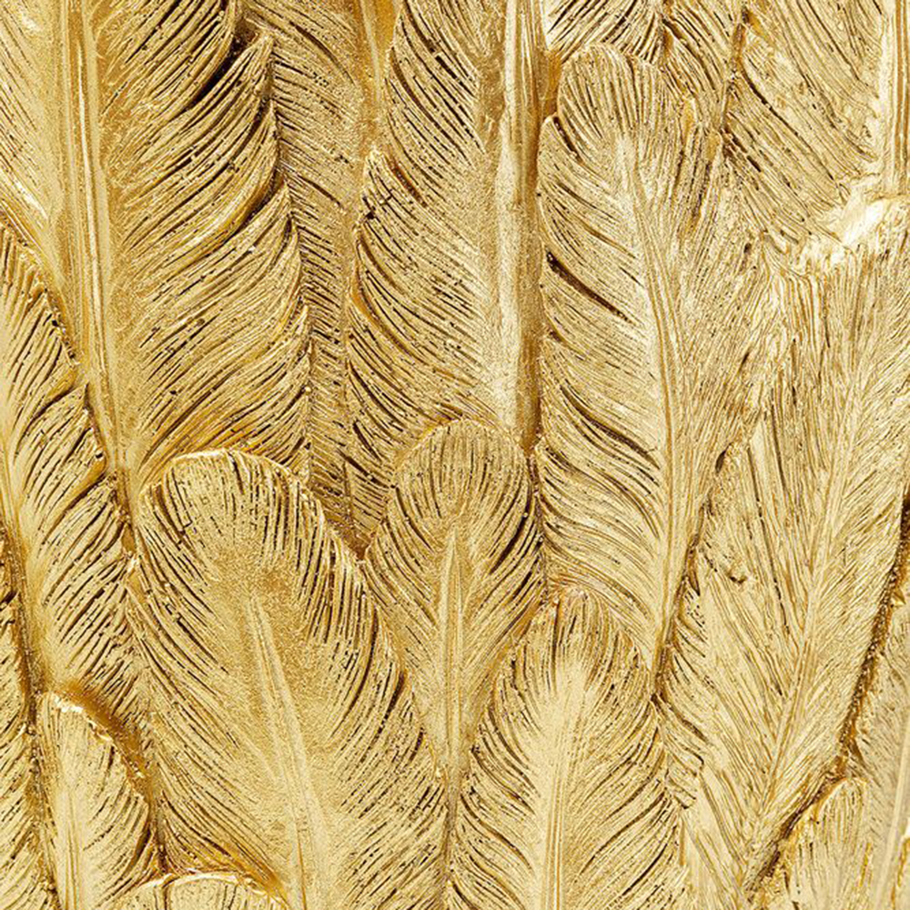Eine äußerst geräumige Vase, die im Design an ein Federkleid erinnert und in goldener Farbe aus Kunstharz gefertigt ist. Dieses spektakuläre Deko-Objekt eignet sich hervorragend für den Flur, das Wohnzimmer oder den Eingangsbereich. Sie wirkt großartig als Bodenvase neben einer Konsole, einem Sofa oder einem Schrank.