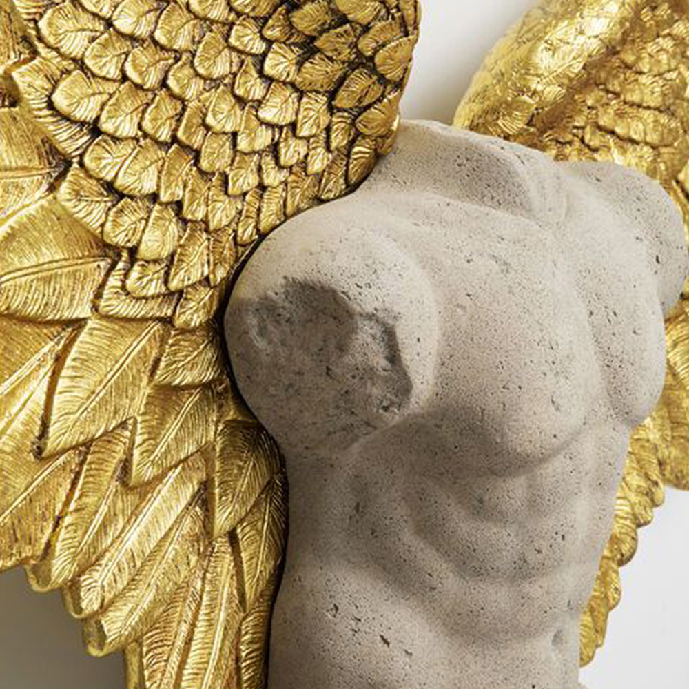 Das Wandobjekt aus Kunststein ist handgearbeitet und aus Polyresin gefertigt, wobei es in Weiß und Gold lackiert wurde. Es ist für die vertikale Wandmontage geeignet. Das ästhetische Design präsentiert einen männlichen Körper mit goldenen Flügeln, was eine eindrucksvolle Wanddekoration für verschiedene Räume wie den Flur, das Wohnzimmer, sowie für Bars oder Restaurants darstellt. Jedes Stück ist ein Unikat, da es handgefertigt ist und somit eine individuelle Note aufweist.